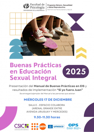 El Programa Género, Sexualidad y Salud Reproductiva del Instituto de Psicología de la Salud (Facultad de Psicología de la Universidad de la República), invita a la actividad “Buenas Prácticas en Educación Sexual Integral”, que se realizará el miércoles 17 de diciembre, de 9:30 a 11:30 horas, en la Sala E – Espacio Colabora (Arenal Grande entre Avenida Uruguay y Mercedes).