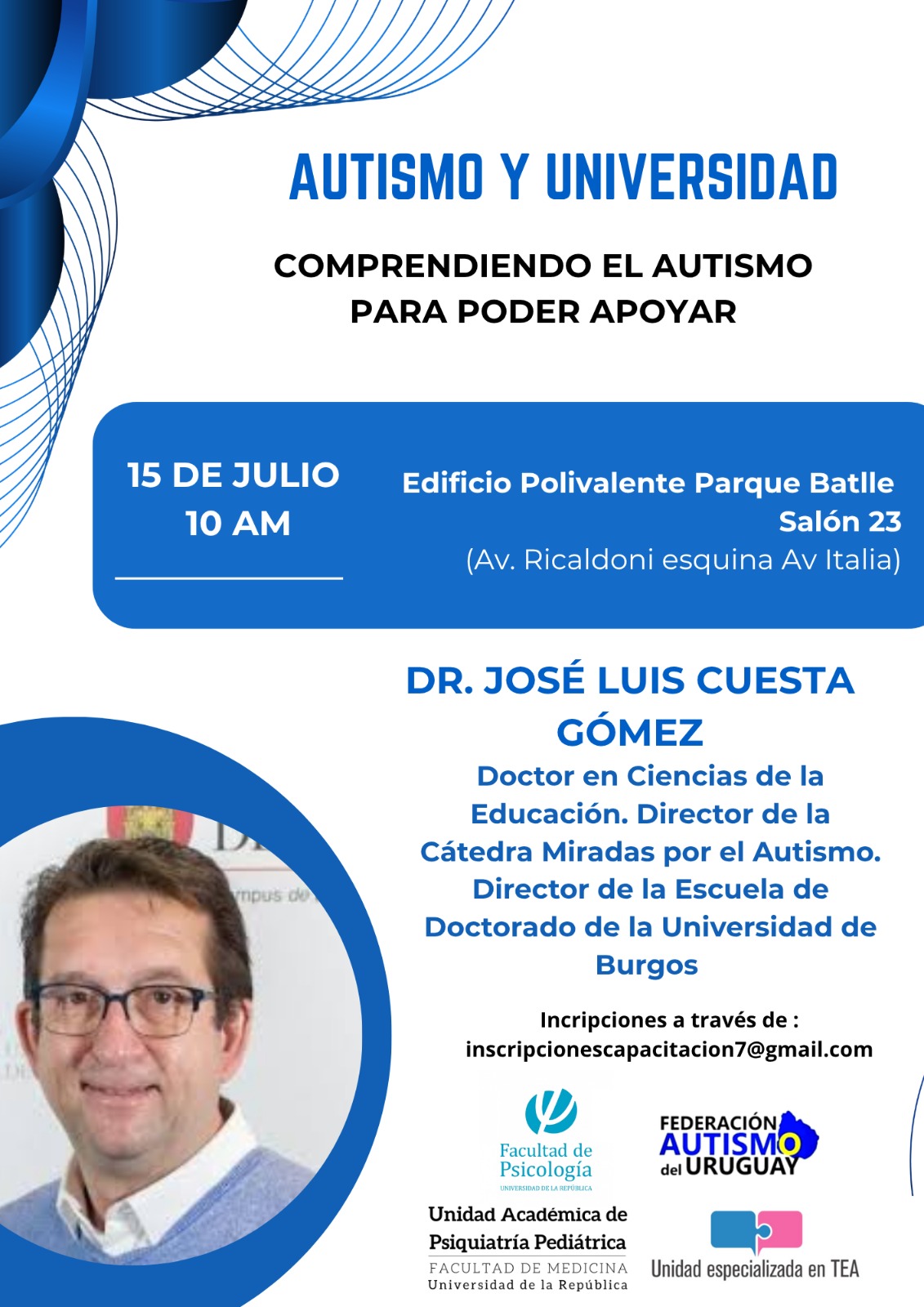 El próximo 15 de julio a las 10 h se realizará la charla “Autismo y Universidad: Comprendiendo el autismo para poder apoyar”, a cargo del Dr. José Luis Cuesta Gómez.