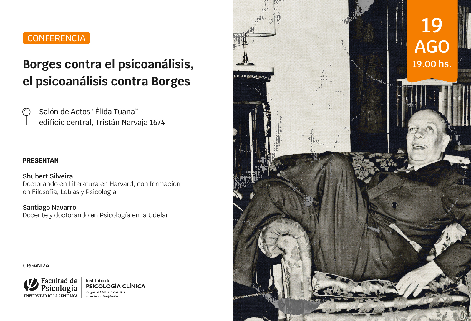 En esta presentación, Shubert Silveira y Santiago Navarro retomarán las críticas que Jorge Luis Borges hizo al psicoanálisis, la publicación de su experiencia analítica por parte de su psicoanalista tras su muerte y la sospecha de un segundo análisis en Montevideo, en 1950.