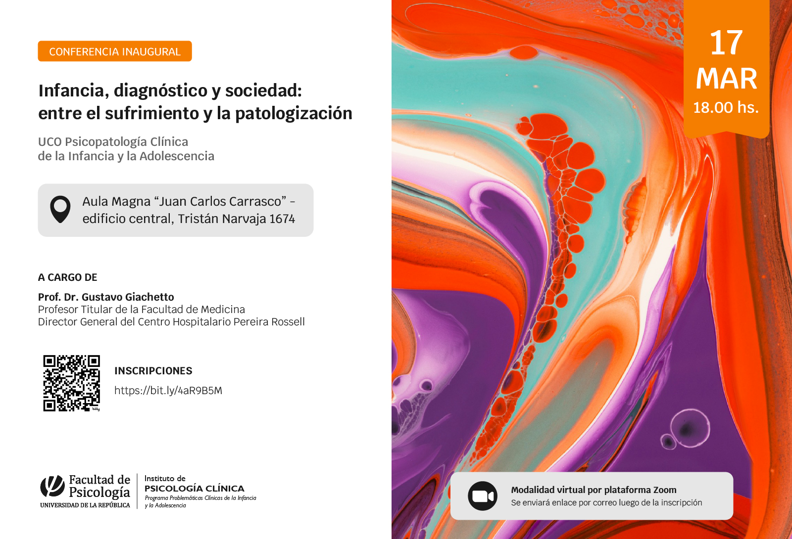 La actividad será el martes 17 marzo, a las 18:00 horas en el Aula Magna y a través de Zoom. Quienes quieran participar desde zoom deberán completar el siguiente formulario para acceder a los datos de conexión.