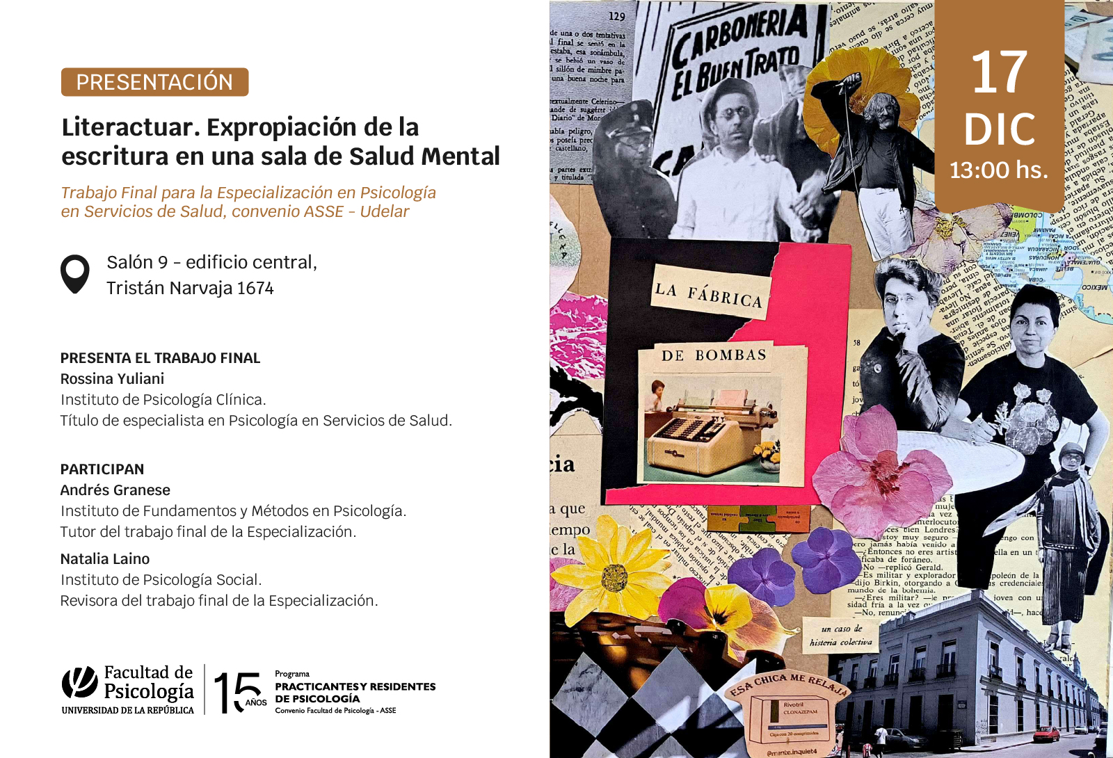 "Literactuar. Expropiación de la escritura en una sala de Salud Mental" cuenta el trabajo realizado por Rossina Yuliani durante su residencia en una sala de salud mental. Allí, junto a otrxs, inventó y desarrolló un dispositivo cuya propuesta fue expropiar la escritura de sus capturas académicas y estéticas y redistribuir la belleza de poder crear un espacio de vida a través de jugar con las palabras.