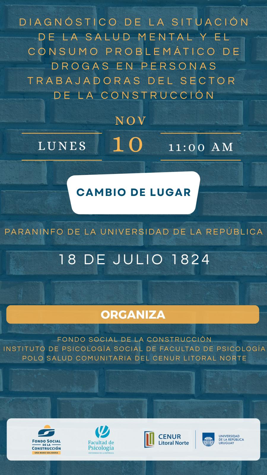 Se presentarán los resultados del diagnóstico sobre la situación de la salud mental y el consumo problemático de drogas en la industria de la construcción. También se compartirá la publicación elaborada conjuntamente por el sindicato y el sector empresarial, a través del Fondo Social de la Construcción, junto con el Instituto de Psicología Social y el Polo de Salud Comunitaria de la Universidad de la República.