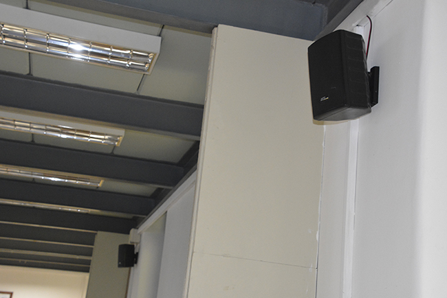 Con el propósito de que el sonido captado por el micrófono y el emitido por la computadora del salón se escuchen en forma envolvente, se realizó la instalación de cuatro parlantes aéreos colocados en las paredes laterales y distribuidos a lo largo del salón.