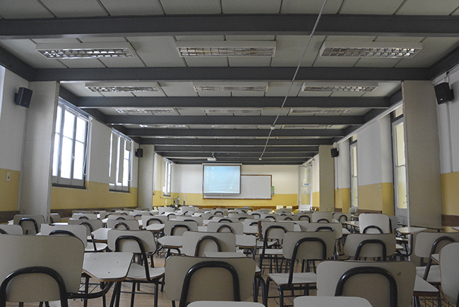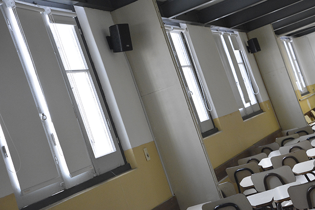 Previo a este acondicionamiento, el salón contaba con dos parlantes de grandes dimensiones sobre trípodes, ambos ubicados contra los ventanales, lo que entorpecía la circulación del sonido y quitaban espacio en las clases con mayor numerosidad.