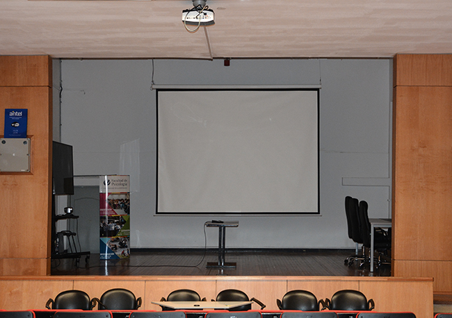 Con la instalación de un equipo de videoconferencia en este espacio (hay disponibles dos equipos más en el Aula Magna y en el Ateneo del Edificio Anexo), el receso de julio permitió completar el equipamiento del Salón de Actos con la colocación de un nuevo cañón y una pantalla eléctrica de 3 metros de ancho.