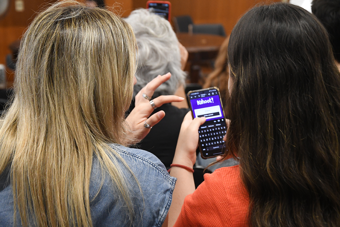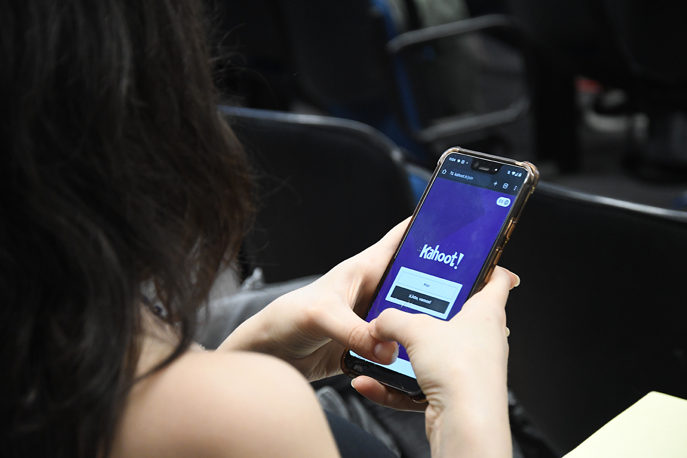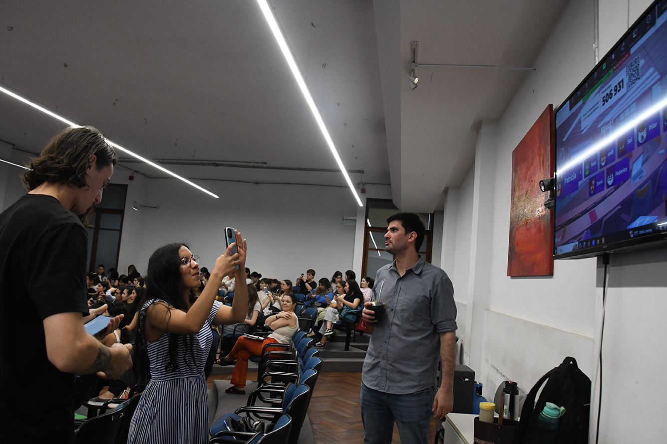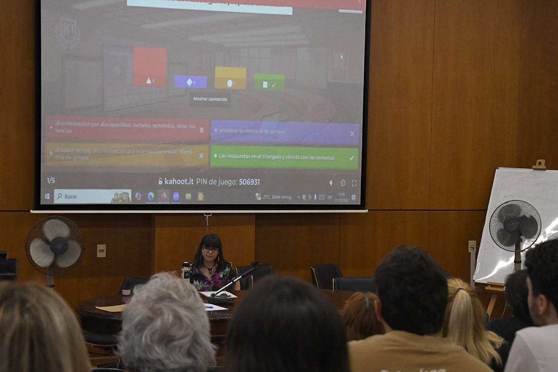 La segunda parte de la reunión estuvo compuesta por la realización de dos dinámicas. La primera fue un juego de preguntas en la plataforma Kahoot, donde se plantearon interrogantes sobre las políticas institucionales de la Facultad en temas de violencia, acoso y discriminación. Las y los estudiantes respondieron en tiempo real desde sus celulares, generándose una discusión sobre los conceptos clave y las normativas.