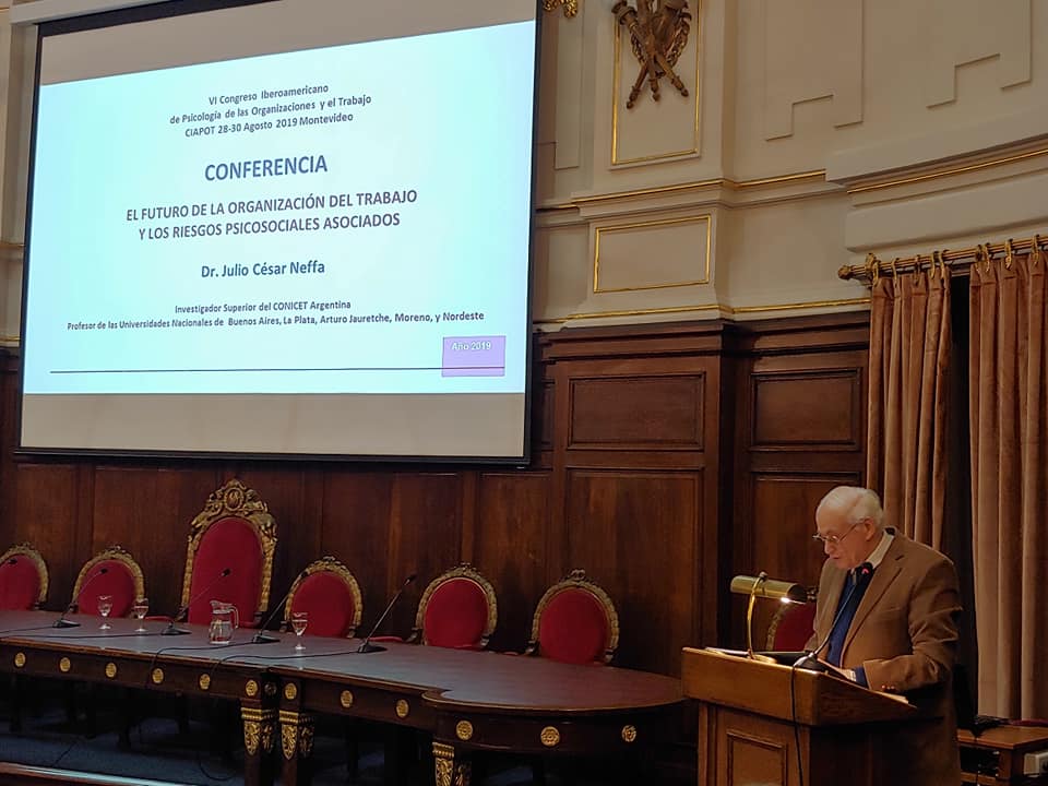 La conferencia de apertura del VI CIAPOT se tituló “El futuro de las Organizaciones del Trabajo y los riesgos psicosociales asociados”, y estuvo a cargo del Dr. Julio César Neffa, de la Universidad de Buenos Aires (UBA).