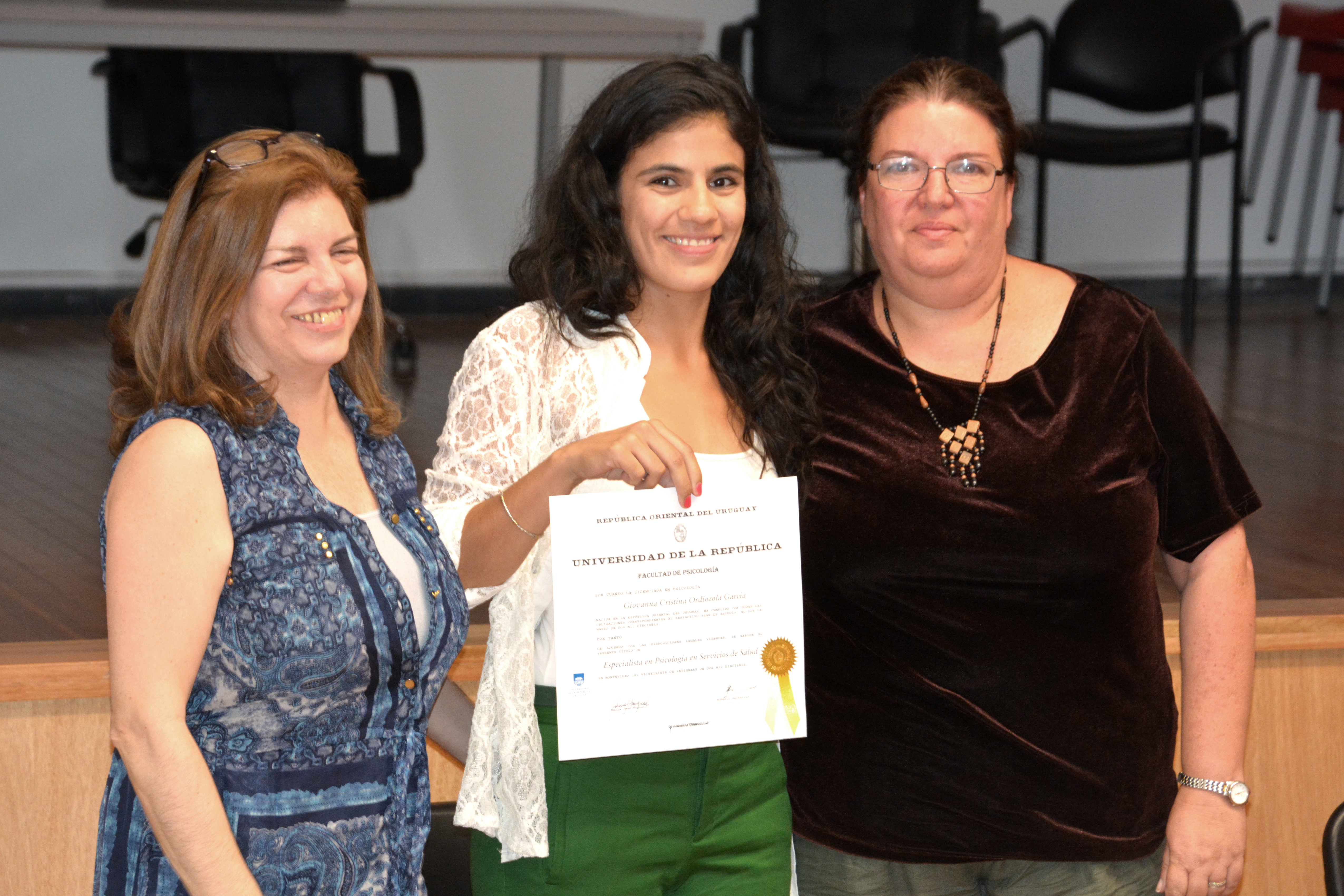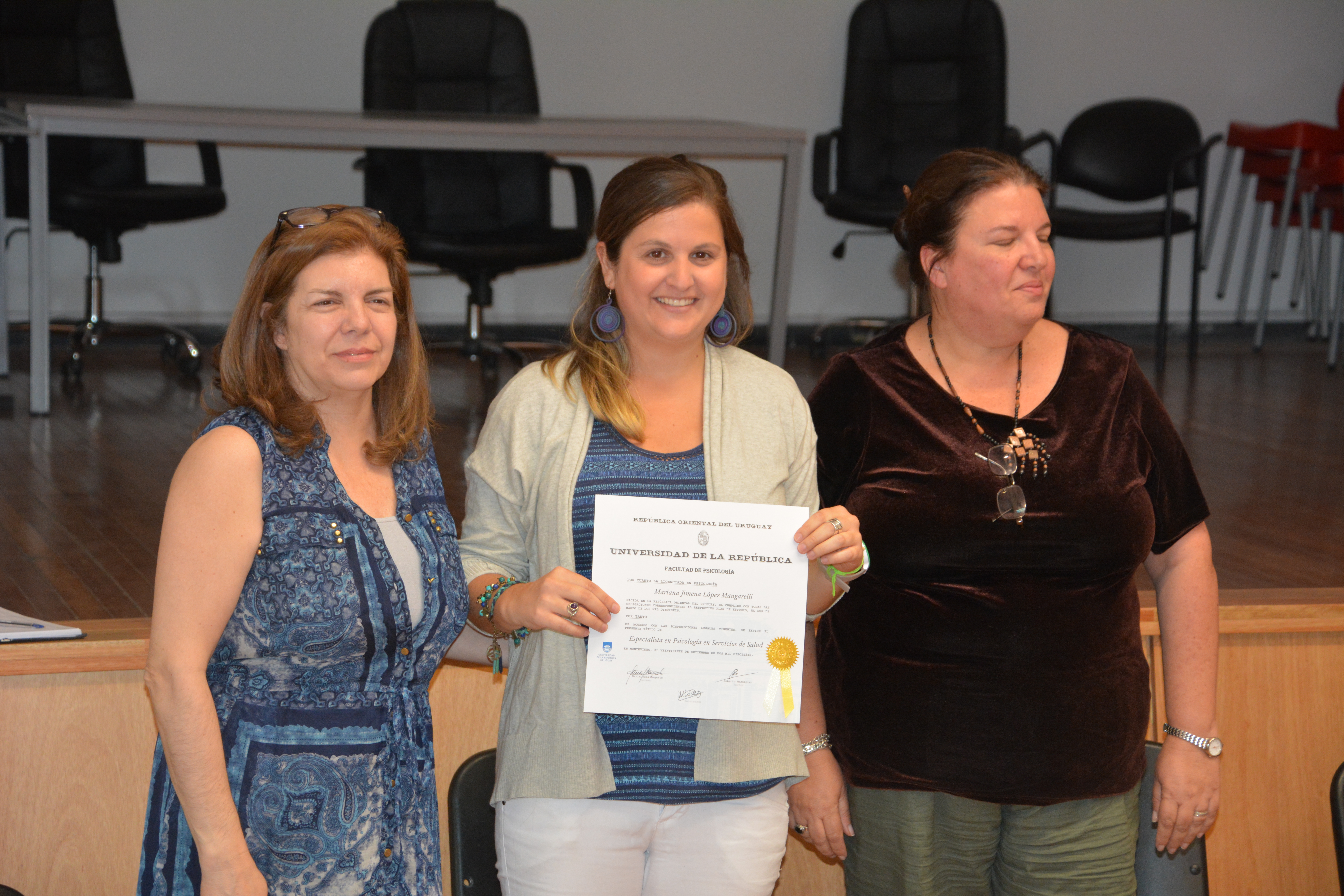 Participaron la Decana, Dra. María José Bagnato; la Prof. Alicia Muniz, una de las Directoras de la Especialización; la Lic. Mag. Natalia Laino, como ex residente e integrante del Comité Interinstitucional para el Convenio; el Lic. Juan Trillo, Coordinador por ASSE para el Convenio; la Lic. Ana Bonilla, en representación de los/as egresados/as, y sus familiares que presenciaron la ceremonia.