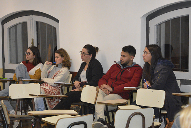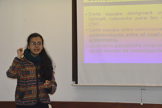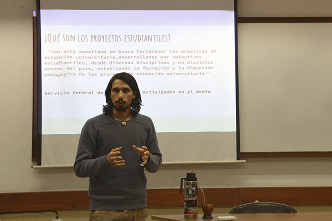 El referente de extensión Gabriel Soto explicó los requisitos y las etapas del proceso de presentación de los proyectos de extensión, así como detalles sobre fondos, compra de equipos y la gestión de los avales necesarios. Luego, Johanna Orrego, Ayudante I+D de la Comisión Sectorial de Investigación Científica (CSIC), informó a estudiantes sobre la convocatoria PAIE y la conformación de equipos de estudiantes y docentes para proyectos de investigación.