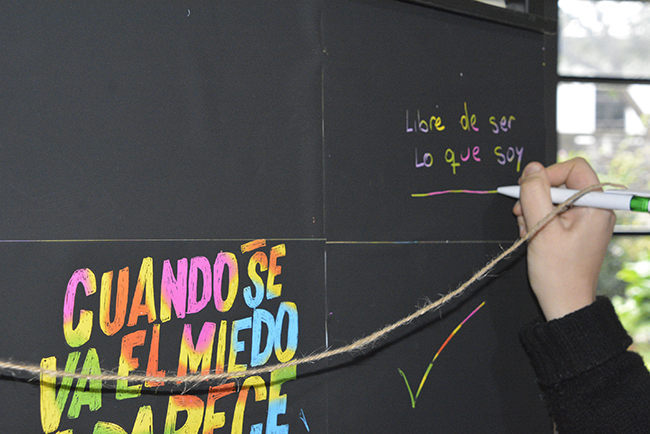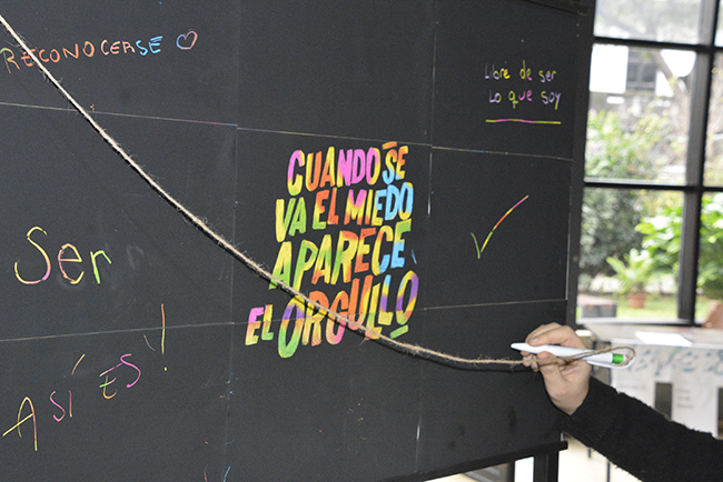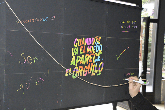 En el marco de este día, desde el 28 de junio y hasta el 5 de julio, permanecerá en el ingreso de la Facultad un tótem para que las personas que así lo deseen puedan intervenirlo dejando su mensaje mediante la técnica de esgrafiado que, bajo una capa negra, deja ver los colores del arcoíris.