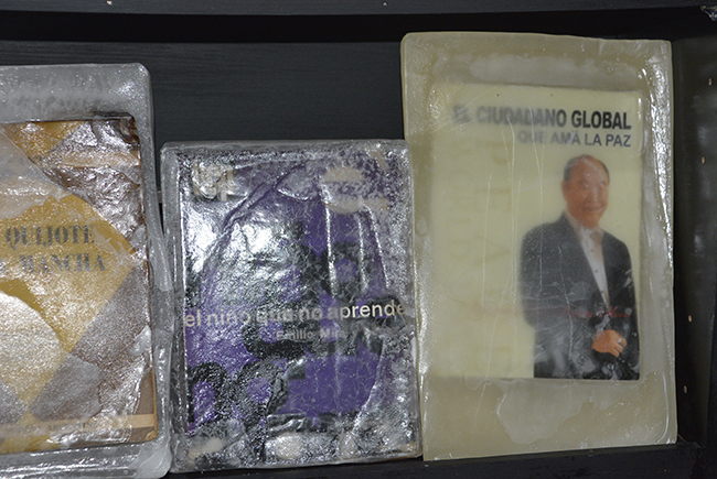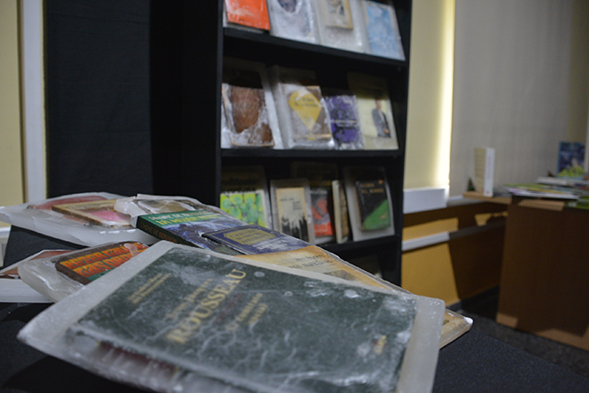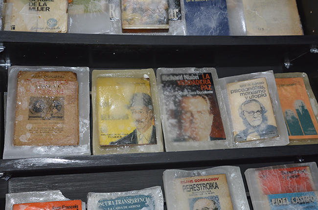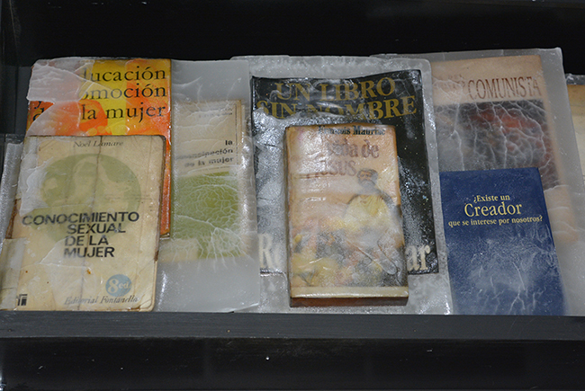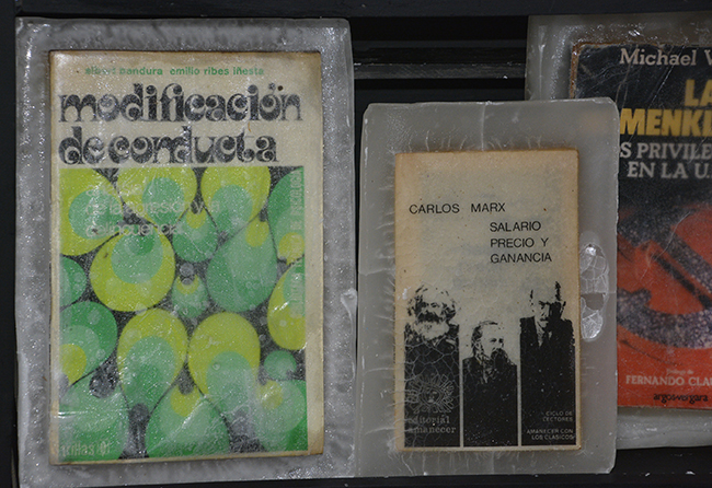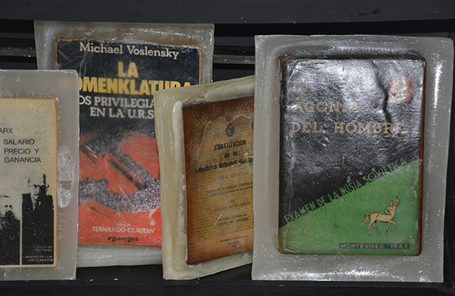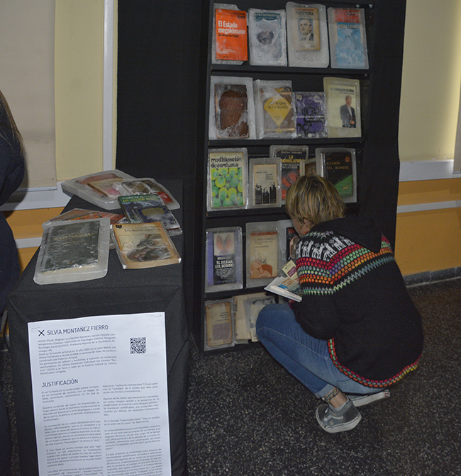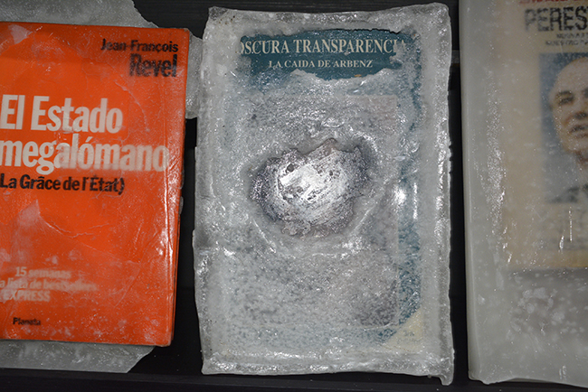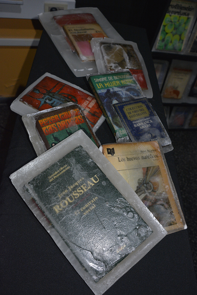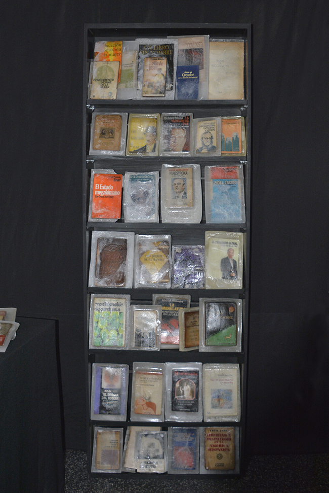 Libros/objeto, elegidos especialmente para la realización de la obra por sus contenidos temáticos y conceptuales, fueron petrificados en parafina. Lucen sobre un fondo negro y su aspecto alude a un objeto congelado. La parafina trasluce y en algunas piezas se craquela, lo que permite visualizar sus carátulas. Las obras literarias seleccionadas atañen a los conceptos de construcción de la subjetividad de la Modernidad. Nociones de autonomía, estado, pueblo, soberanía, trabajo, placer, sexualidad y familia, fueron elegidas a través de los libros sumergidos en parafina. Éstos conceptos han sufrido cambios significativos en esta nueva época; surgen diferentes perspectivas y nuevos abordajes en el acontecer humano.