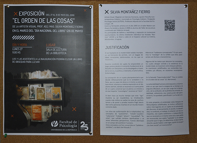 La muestra de la Artista Visual Prof. Adj. Mag. Silvia Montañez Fierro “El orden de las cosas” se inauguró el lunes 27 de mayo a las 11 hs en la Sala de Lectura de la Biblioteca de la Facultad.