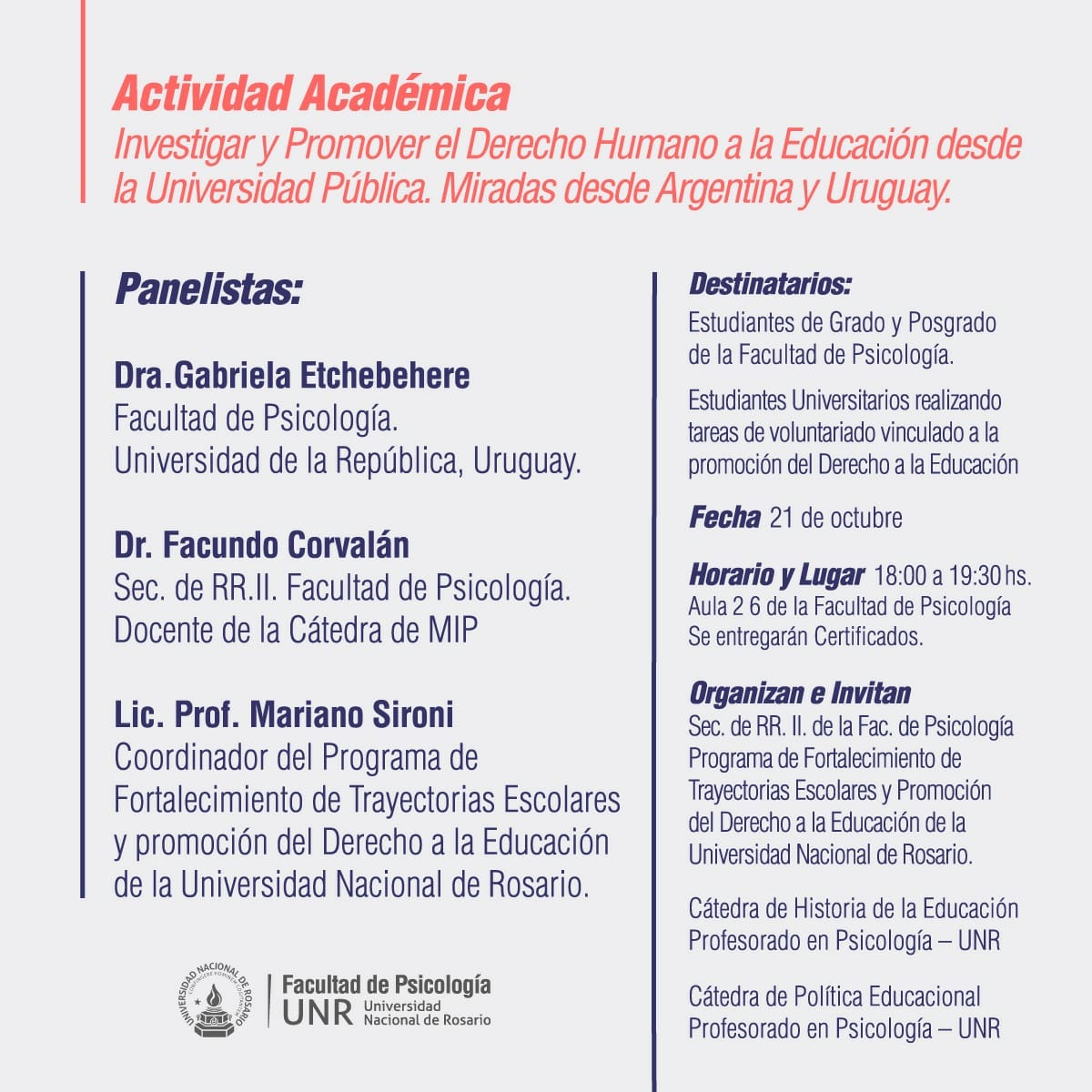 Durante su estadía en Rosario, el 21 de octubre de 2019 participó en la actividad académica “Investigar y Promover el Derecho Humano a la Educación desde la Universidad Pública. Miradas desde Argentina y Uruguay”, integrando el panel de expositores en representación de Uruguay.