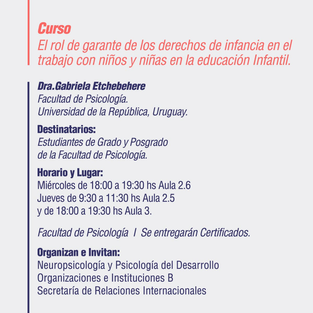 Asimismo, la Dra. Etchebehere estuvo a cargo del curso titulado “El rol garante de los derechos de infancia en el trabajo con niños y niñas en la educación infantil”, orientado a estudiantes de grado y posgrado de la Facultad de Psicología de la UNR.