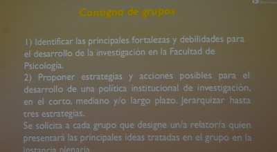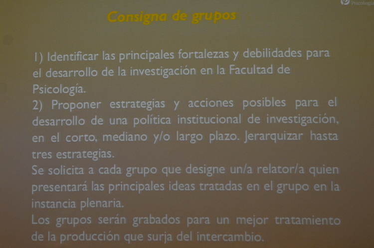 Tras las exposiciones del Pro Rector de Investigación, Gregory Randall, el decano de la Facultad, Luis Leopold, y el equipo de Programa de Apoyo a la Investigación de Calidad, se planteó a los presentes la consigna de analizar fortalezas y debilidades para el desarrollo de una investigación con calidad en la Facultad, así como identificar estrategias y acciones posibles para el corto, mediano y largo plazo.