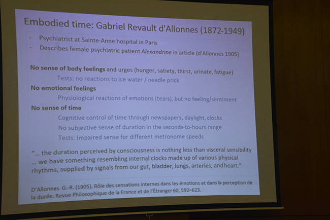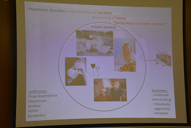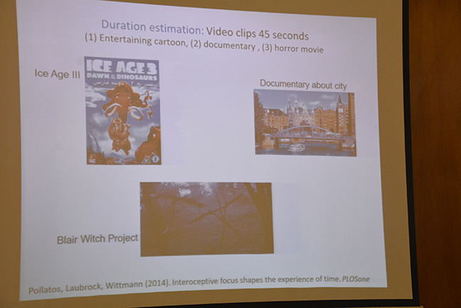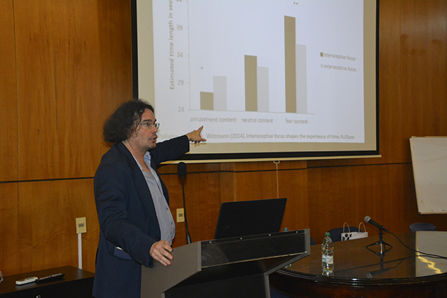 El profesor retomó de la conferencia de la Dra. Umbelina do Rego las perspectivas de tiempo, en que la atención y el nivel de estímulo son moduladores del tiempo subjetivo. Repasó una serie de experimentos que muestran, por ejemplo, que si se presta atención al tiempo, éste se alarga, y si una persona tiene muchos recuerdos de un período de tiempo pasado, ese tiempo subjetivo también se alarga.