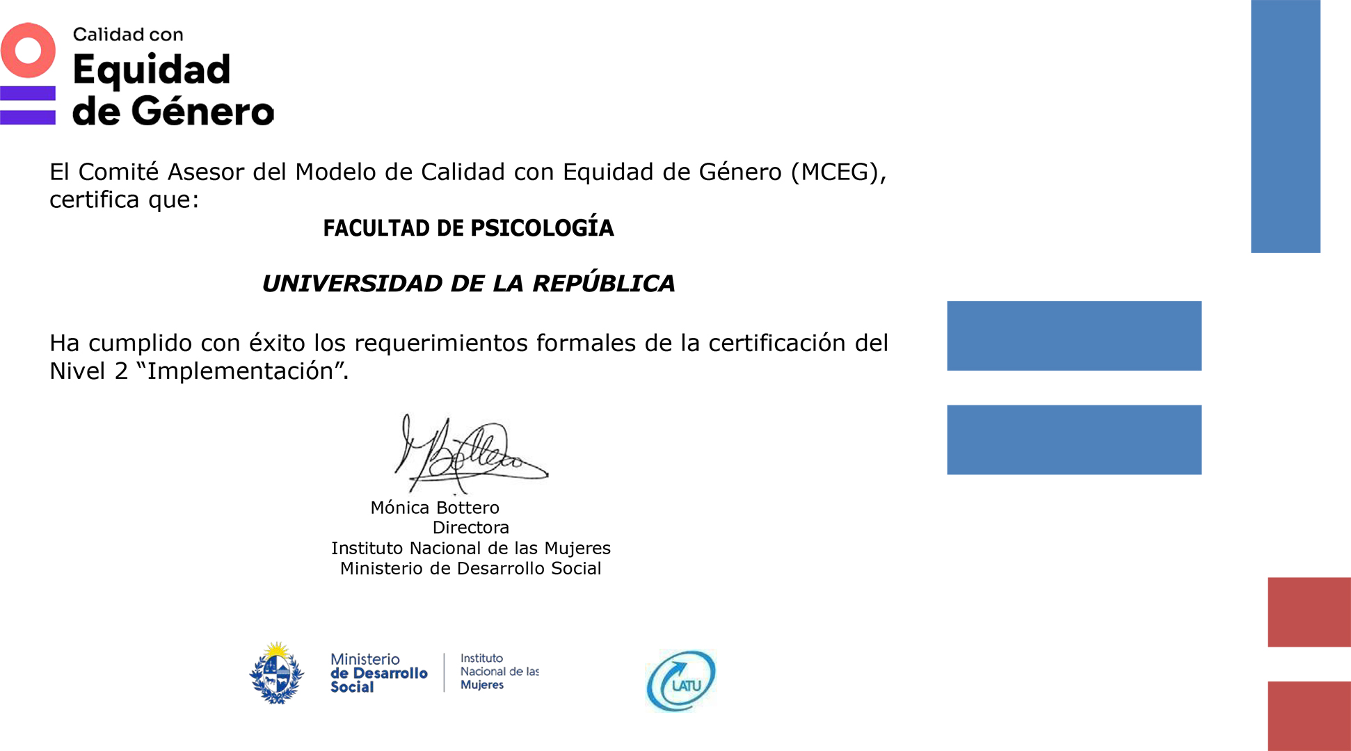 La Facultad de Psicología de la Universidad de la República (Udelar) obtuvo, tras una auditoría y evaluación, el certificado de Nivel II del Modelo de Calidad con Equidad de Género (MCEG), otorgado por el Comité Asesor del Instituto Nacional de las Mujeres (Inmujeres) del Ministerio de Desarrollo Social (Mides), en conjunto con el Laboratorio Tecnológico del Uruguay (LATU).