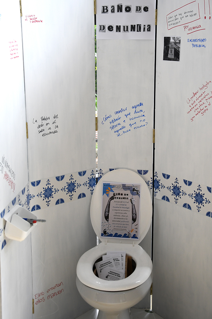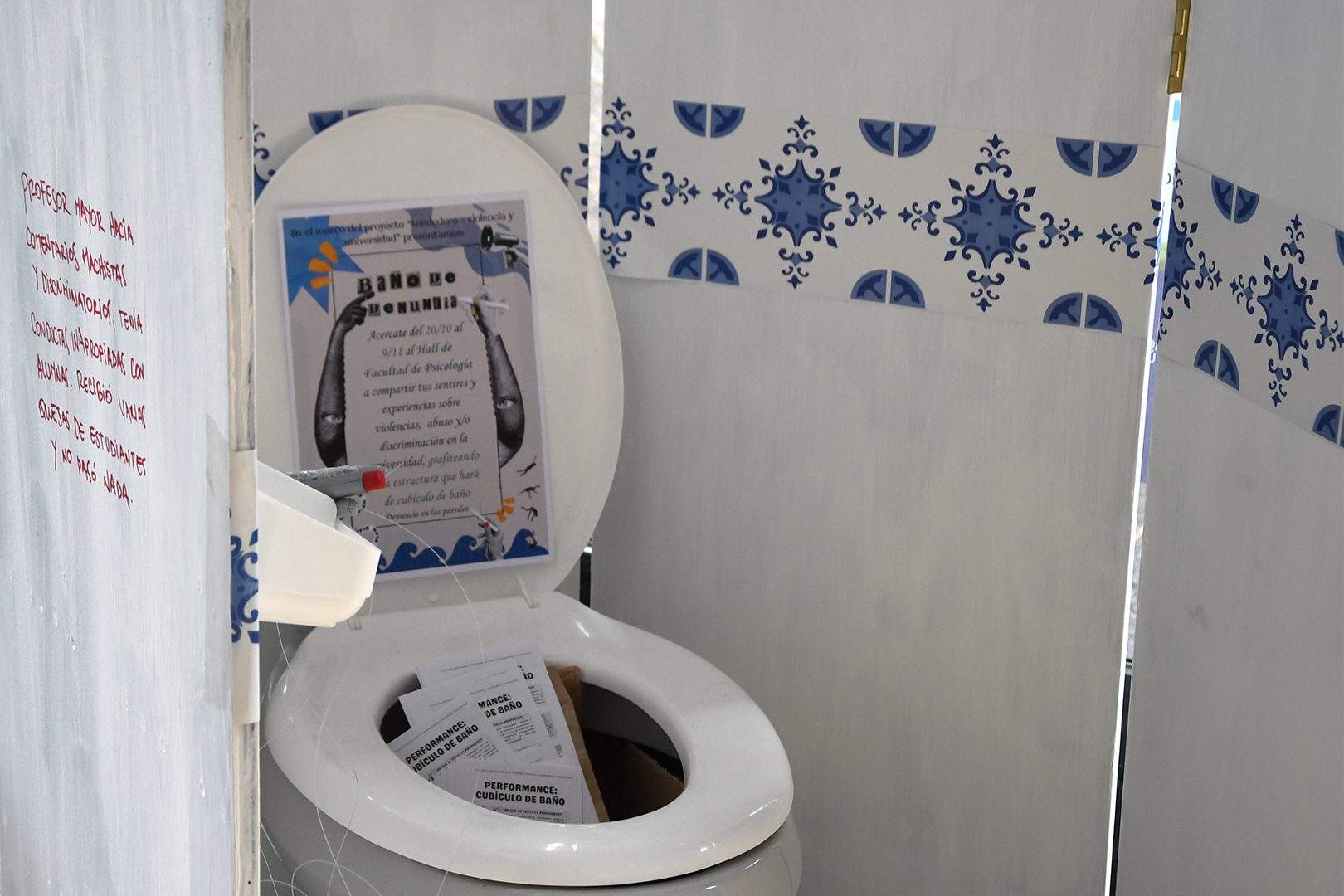 Instalación “Baño de denuncia” en el hall de ingreso de la Facultad de Psicología