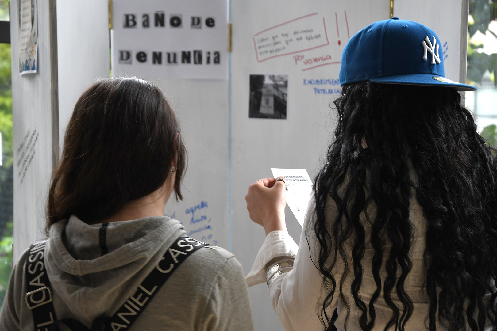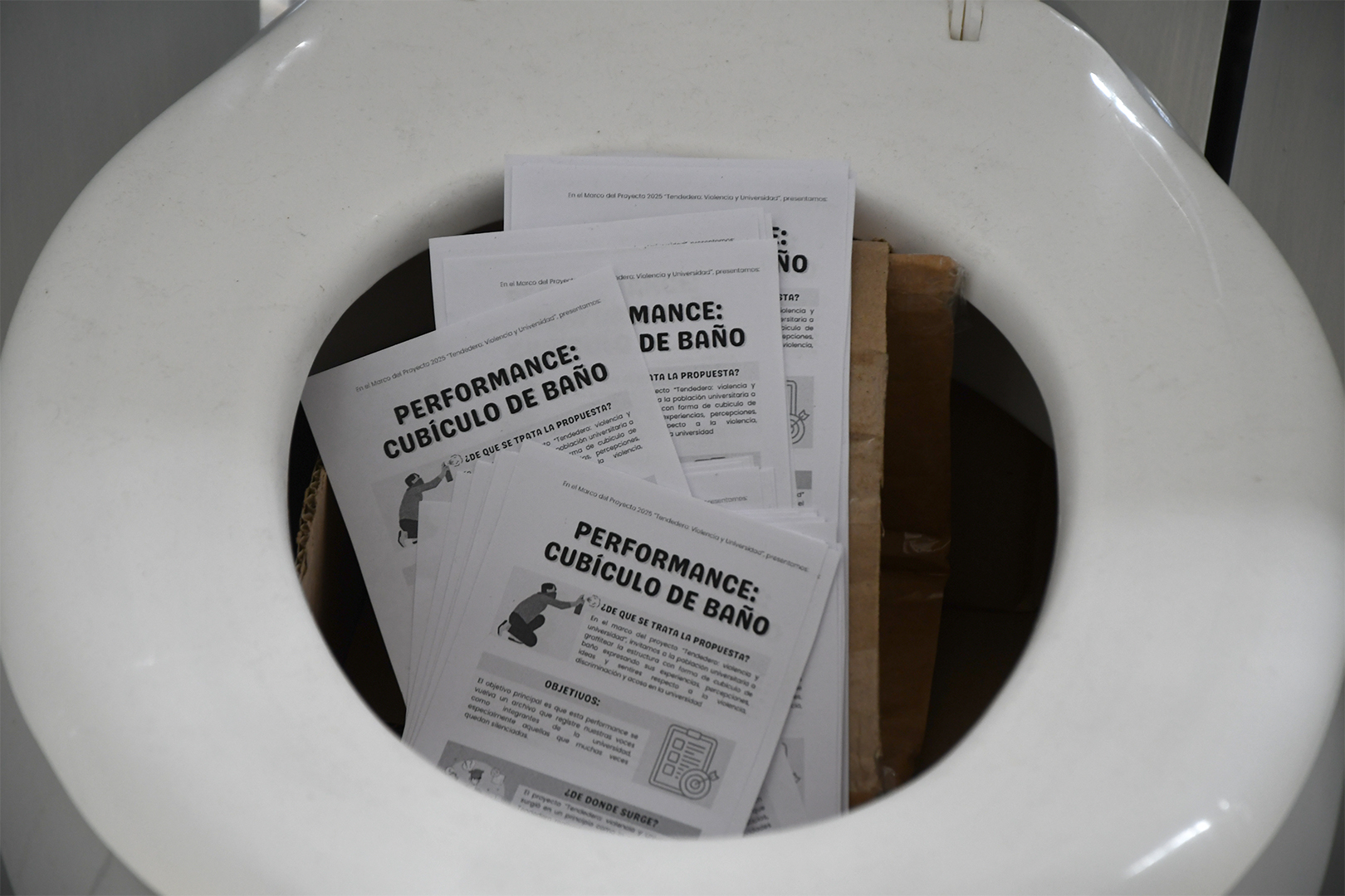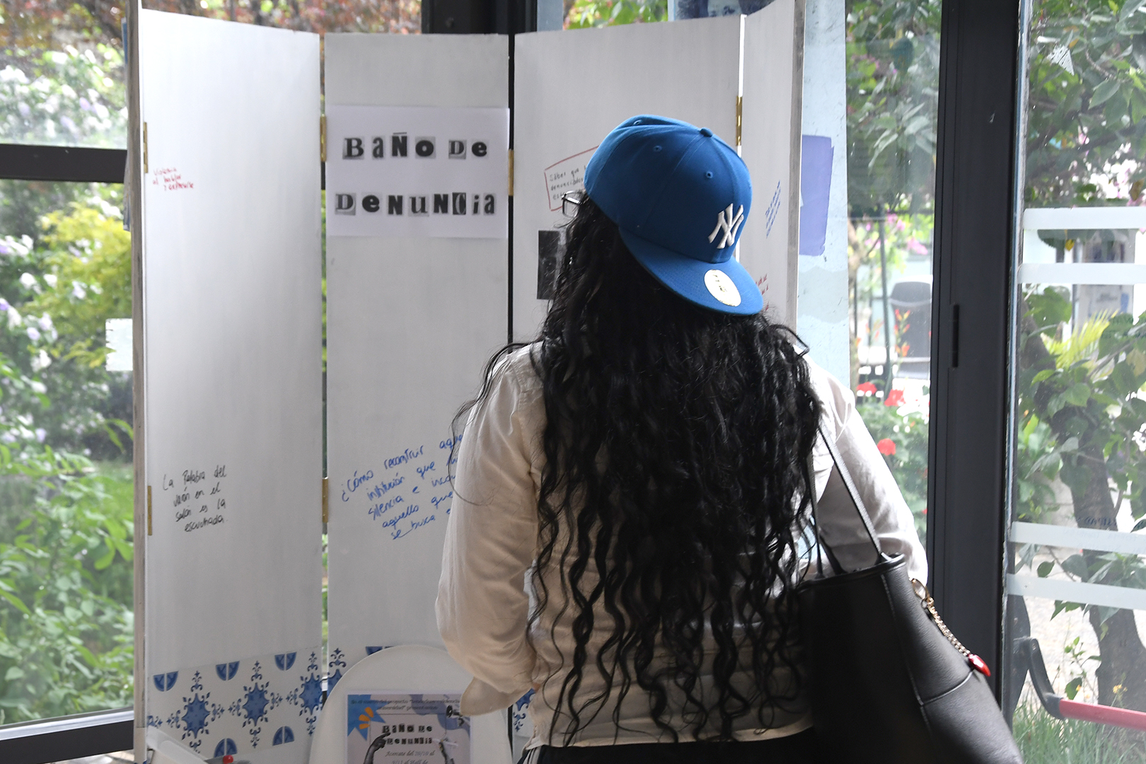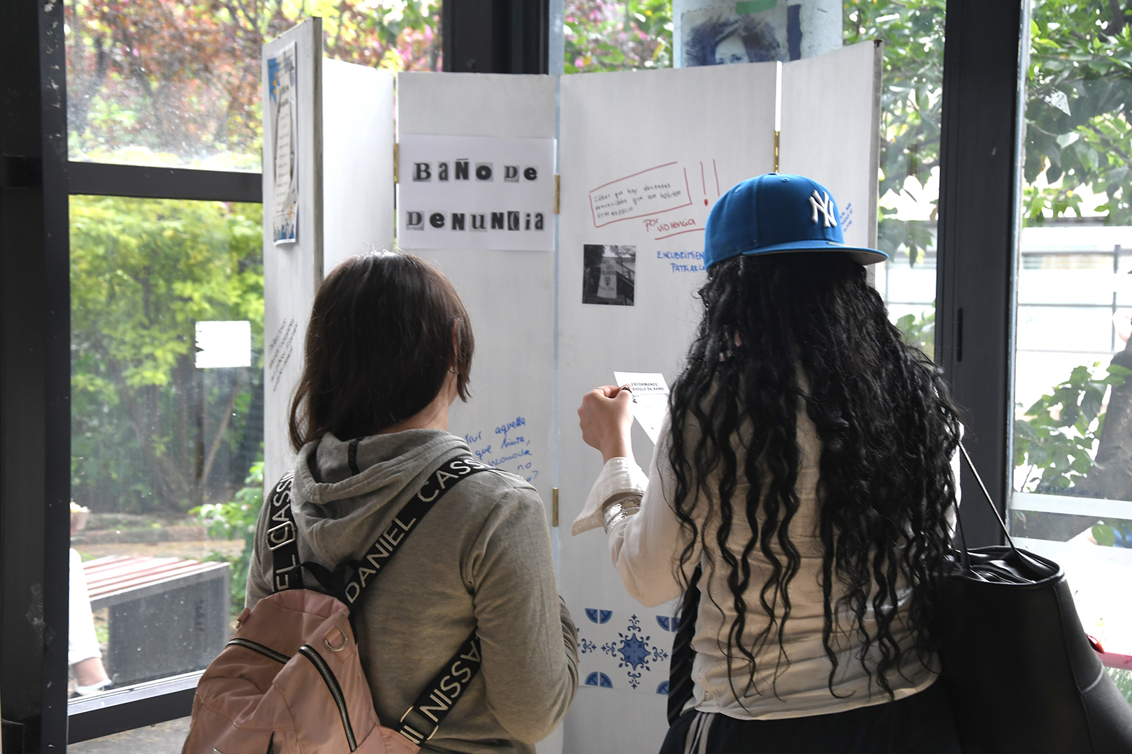La instalación consiste en un pequeño cubículo donde las personas que transitan por el espacio pueden expresar, a través del grafiti, sentires y afectos vinculados a experiencias de violencia, acoso o discriminación en el ámbito universitario. La propuesta retoma una práctica que históricamente ha ocupado los baños y otros espacios comunes de la Universidad, trasladando esas expresiones a un lugar visible y compartido.