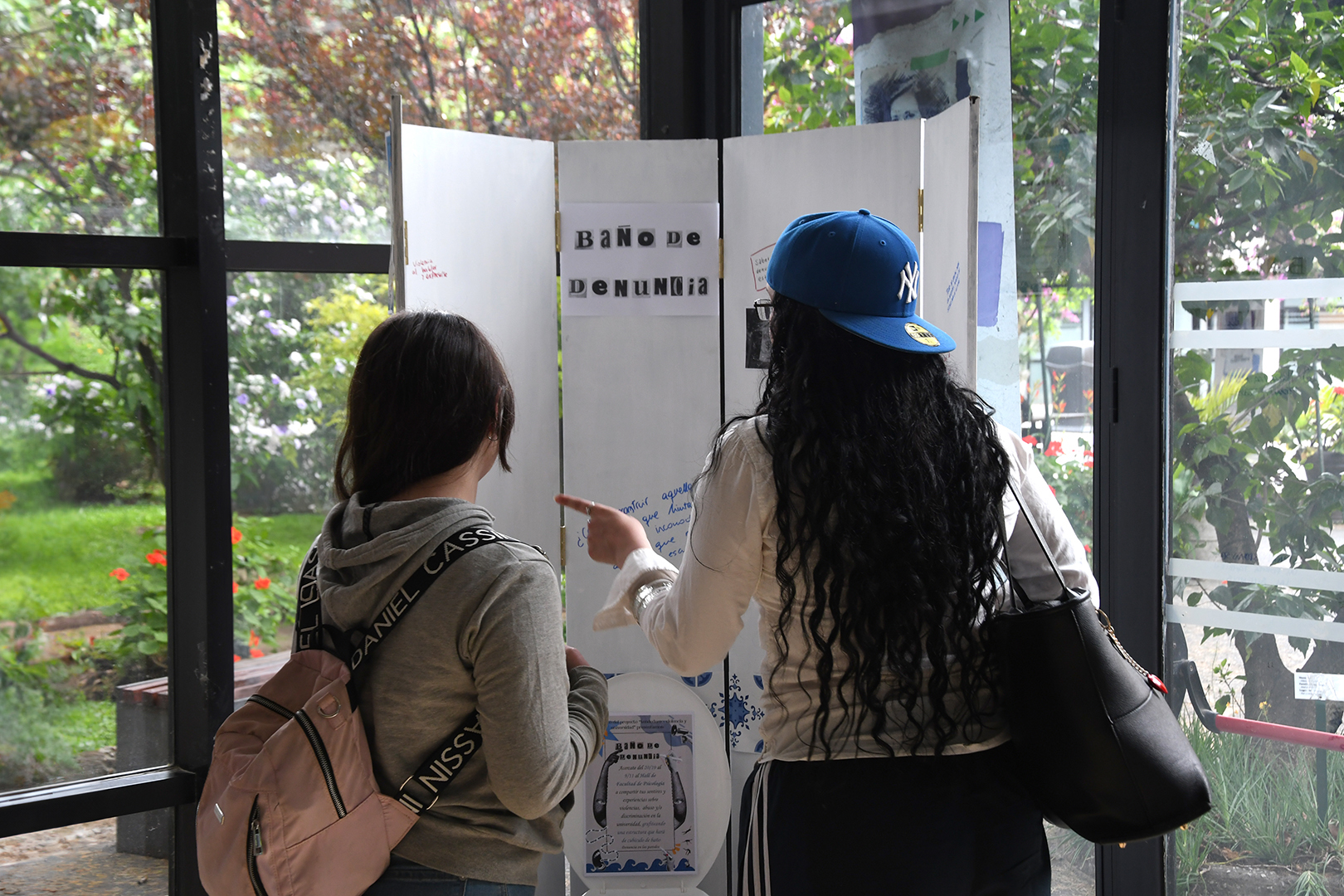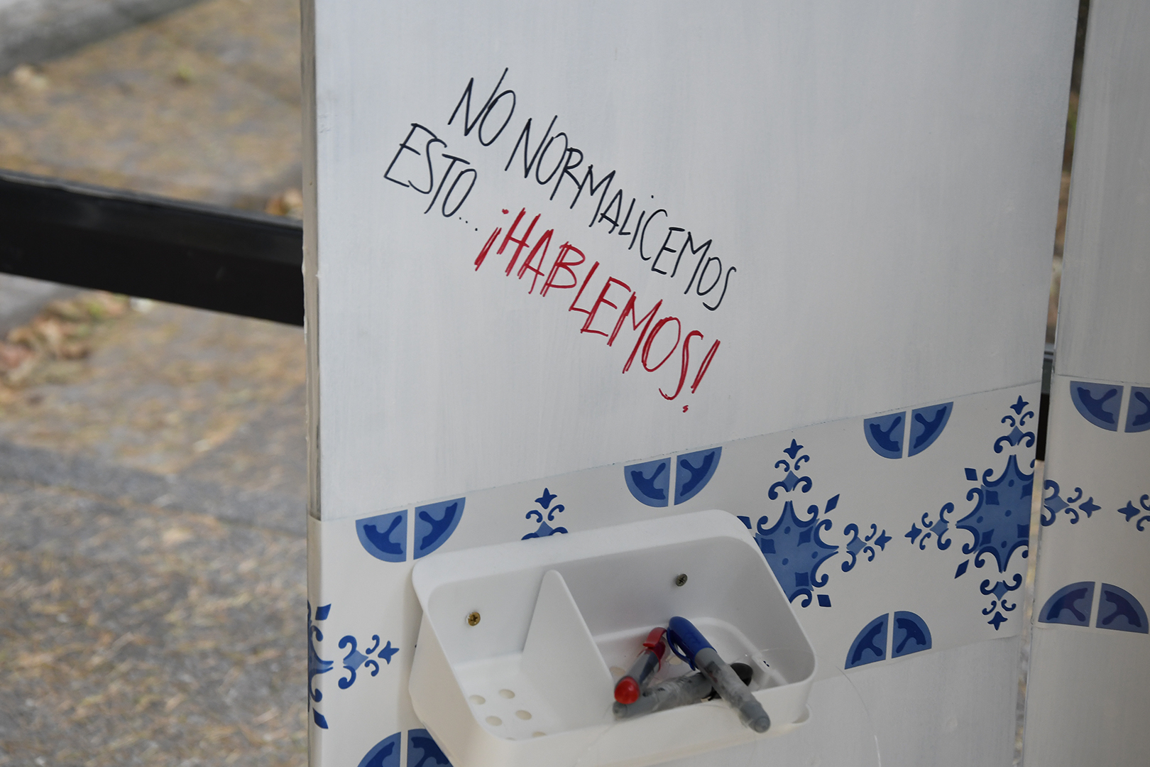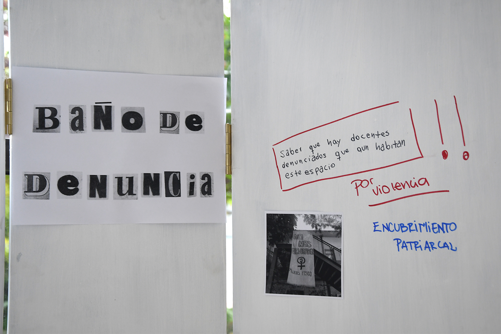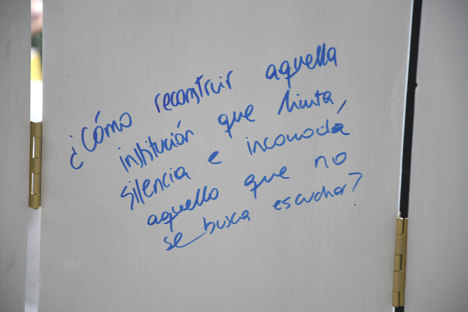 La instalación consiste en un pequeño cubículo donde las personas que transitan por el espacio pueden expresar, a través del grafiti, sentires y afectos vinculados a experiencias de violencia, acoso o discriminación en el ámbito universitario. La propuesta retoma una práctica que históricamente ha ocupado los baños y otros espacios comunes de la Universidad, trasladando esas expresiones a un lugar visible y compartido.