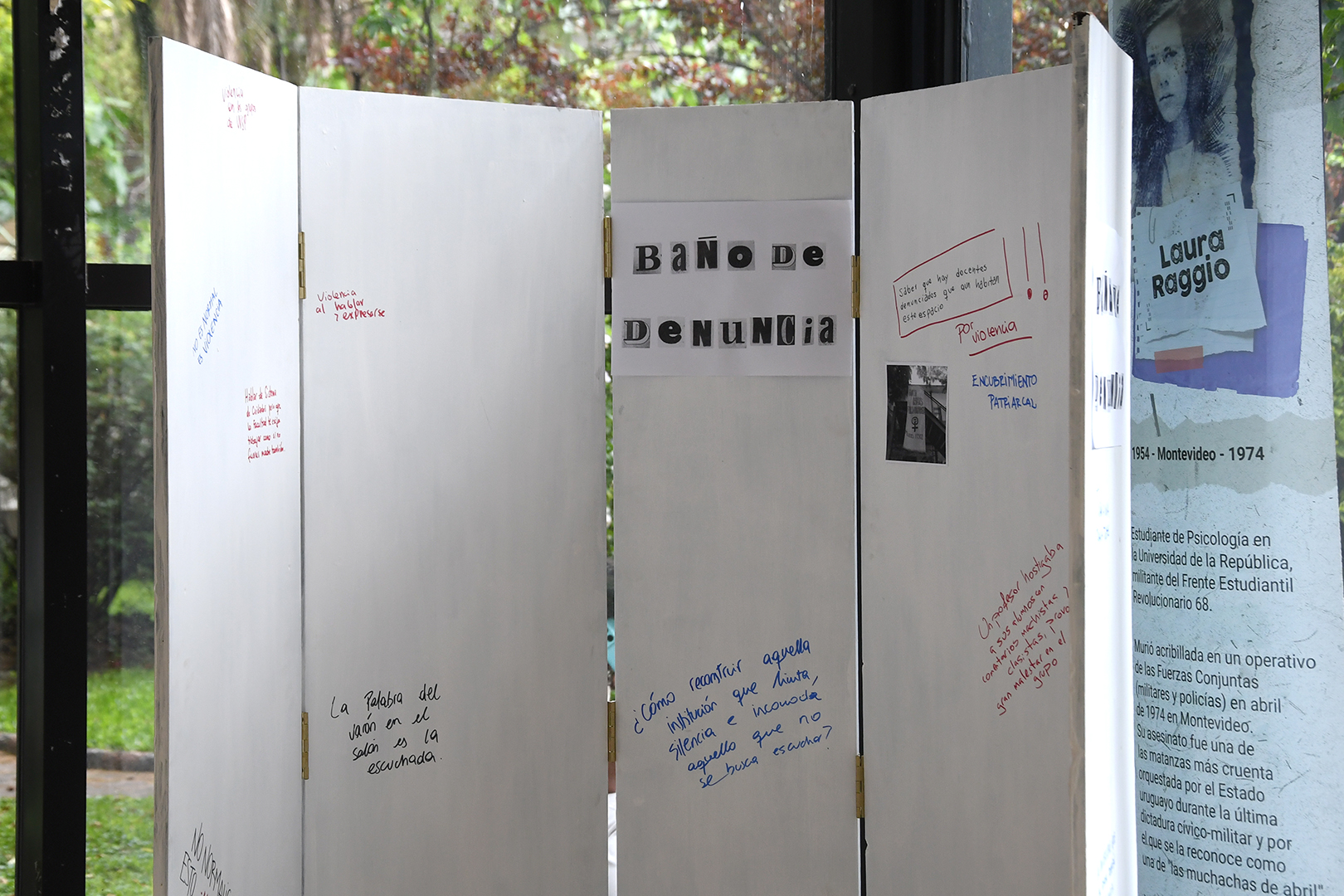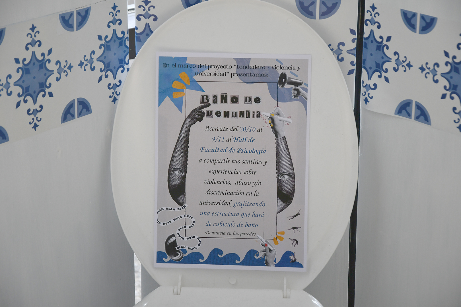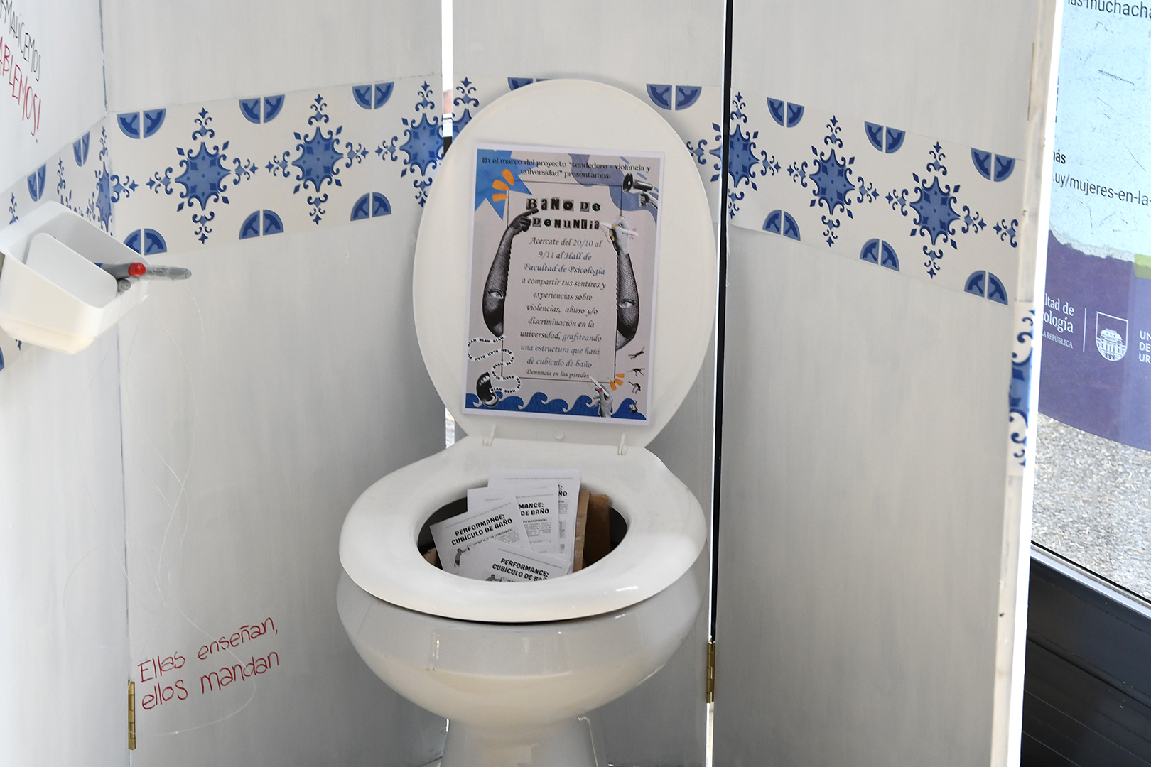 Quedó instalada en el hall de ingreso de la Facultad de Psicología la intervención “Baño de denuncia", en el marco del proyecto "Tendedero: violencia y universidad”, una propuesta performativa a cargo de la Prof. Adj. Dra. Adriana Rovira y la Mag. Sandra López con el apoyo del Comité de Equidad y Género de la Facultad.