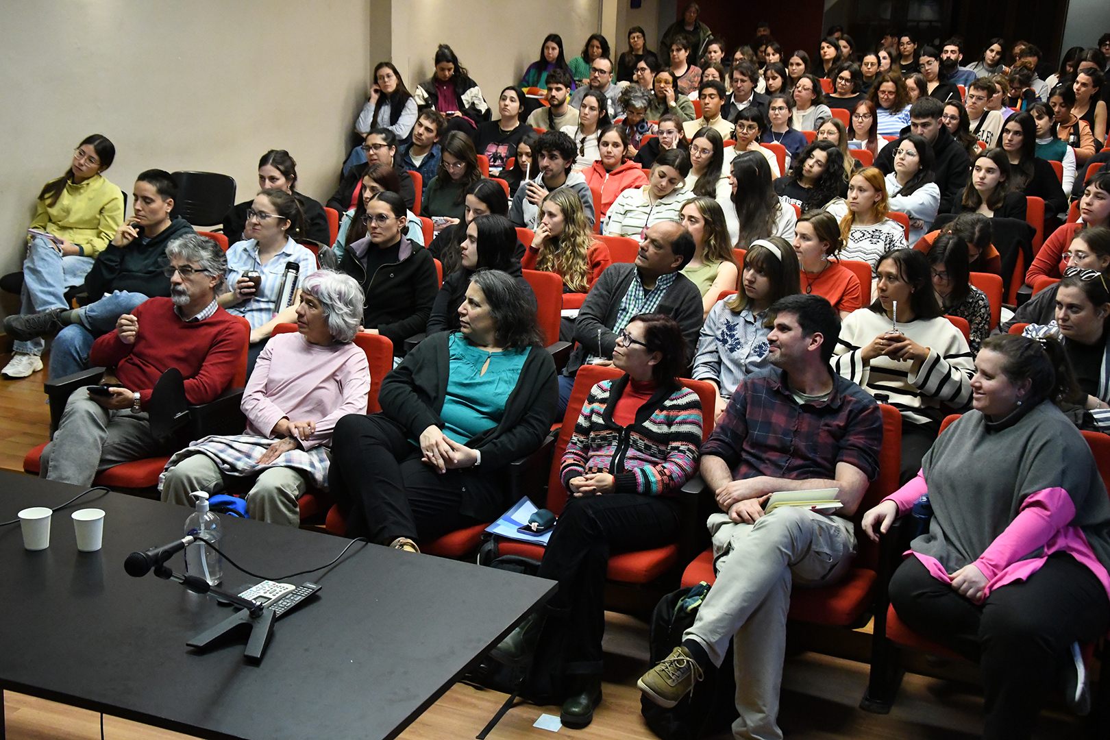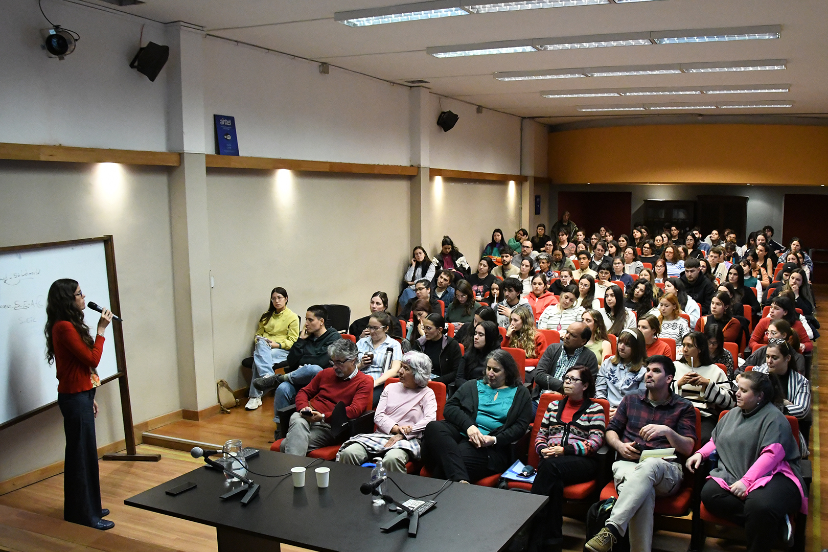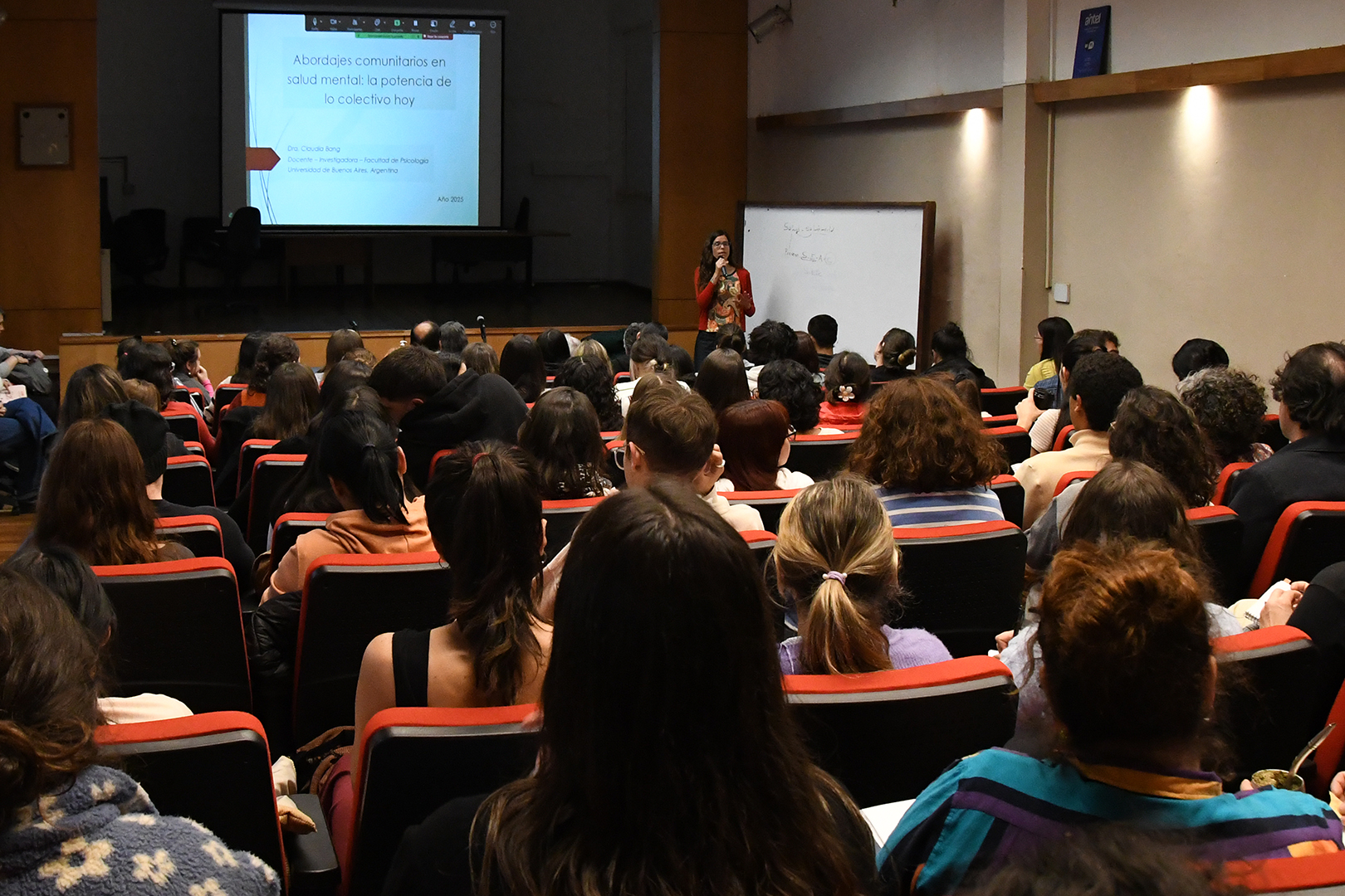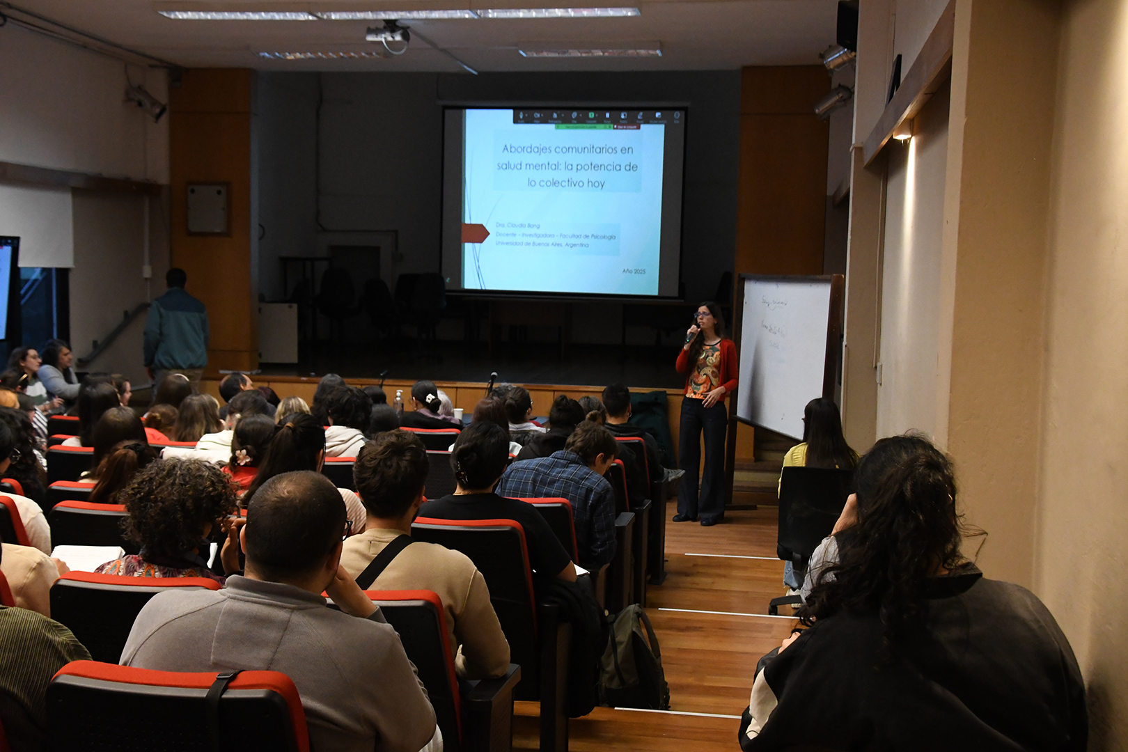 En un salón de actos Élida Tuana, la doctora en Psicología argentina, Claudia Bang, ofreció la conferencia Abordajes comunitarios en salud mental: la potencia de lo colectivo hoy, invitada por el Programa Practicantado en Psicología organizado en convenio por la Facultad de Psicología de la Universidad de la República y la Intendencia de Montevideo.