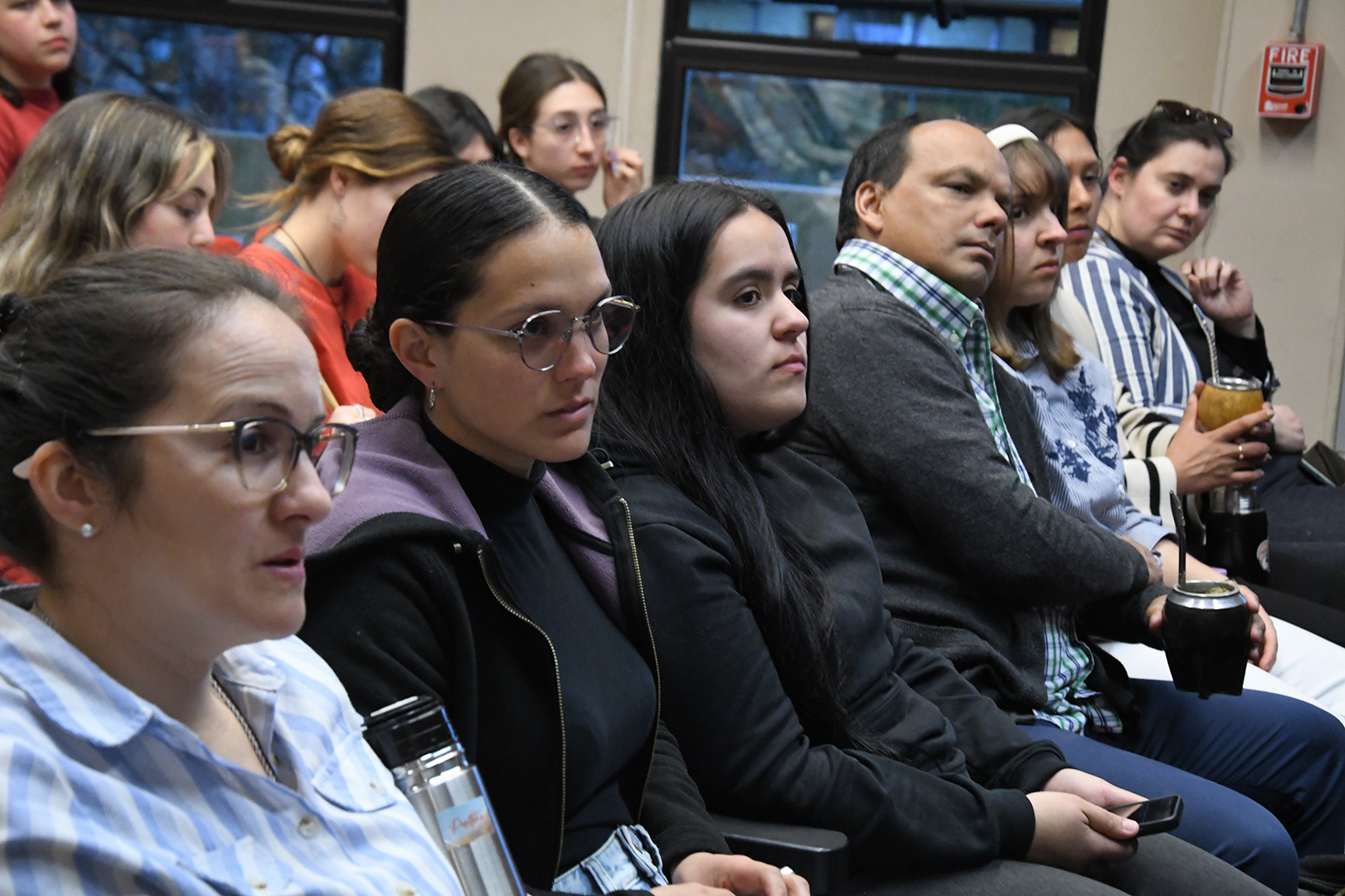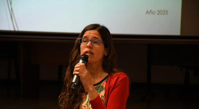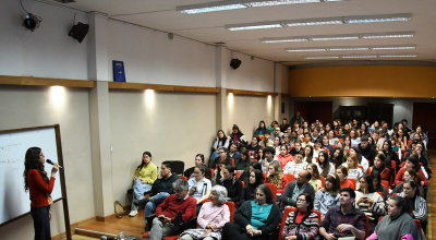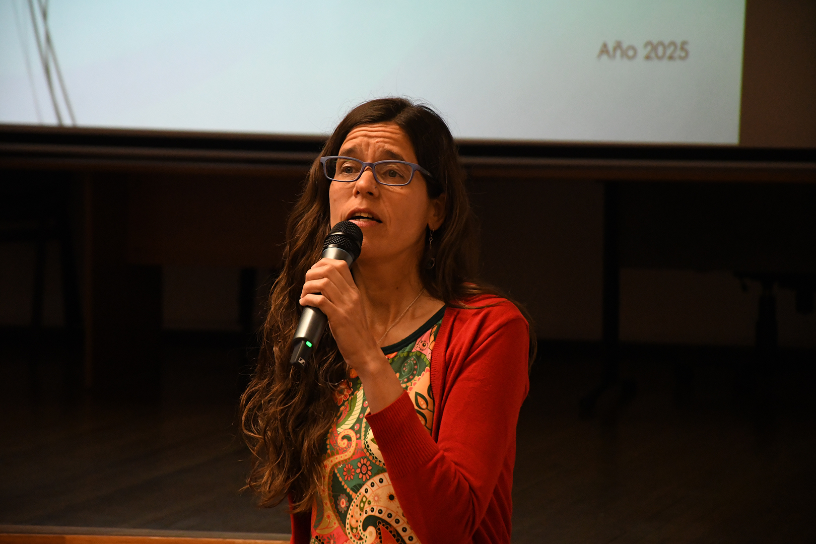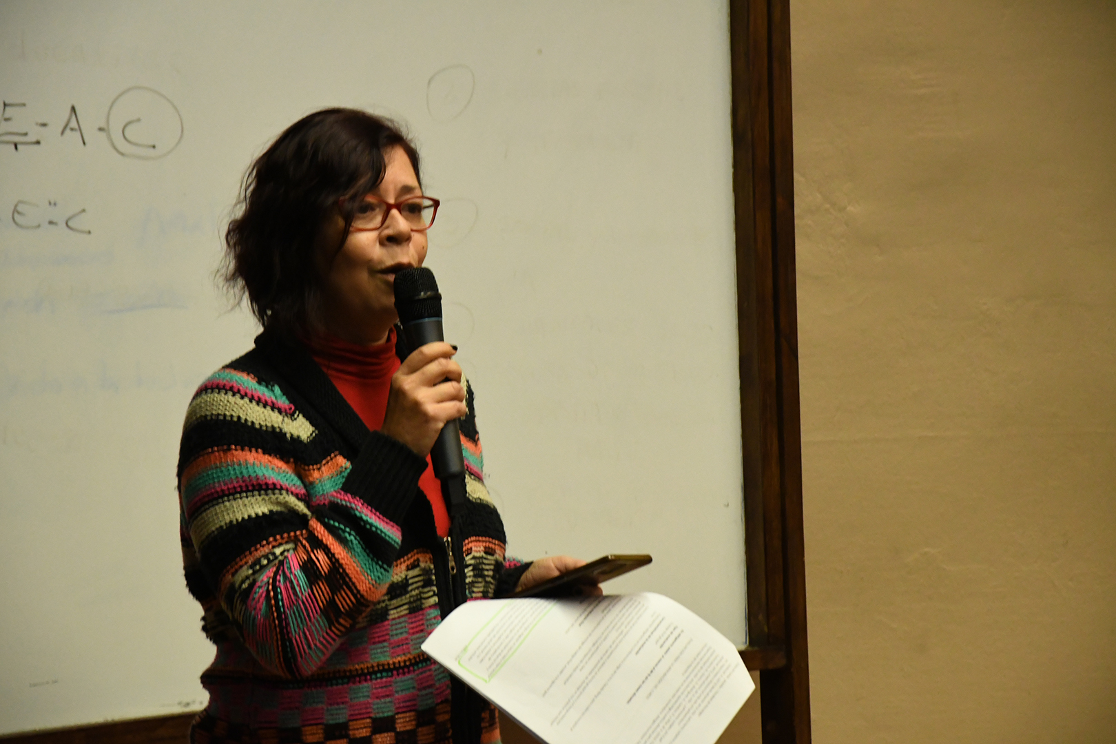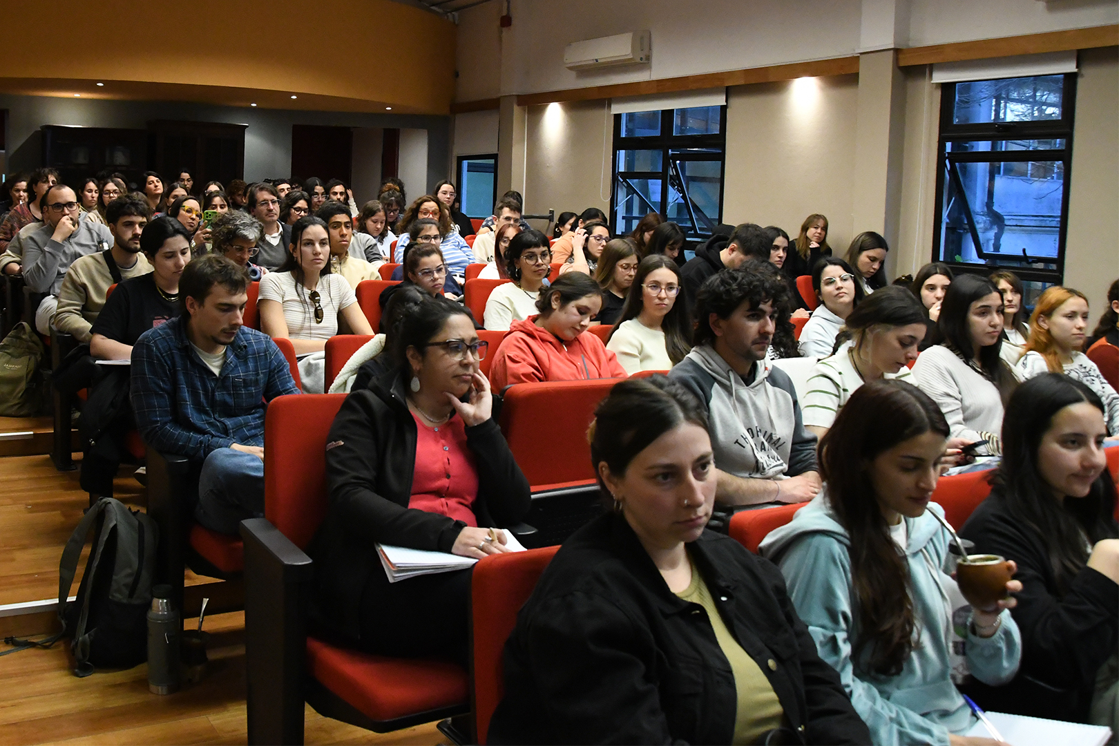 En un salón de actos Élida Tuana, la doctora en Psicología argentina, Claudia Bang, ofreció la conferencia Abordajes comunitarios en salud mental: la potencia de lo colectivo hoy, invitada por el Programa Practicantado en Psicología organizado en convenio por la Facultad de Psicología de la Universidad de la República y la Intendencia de Montevideo.