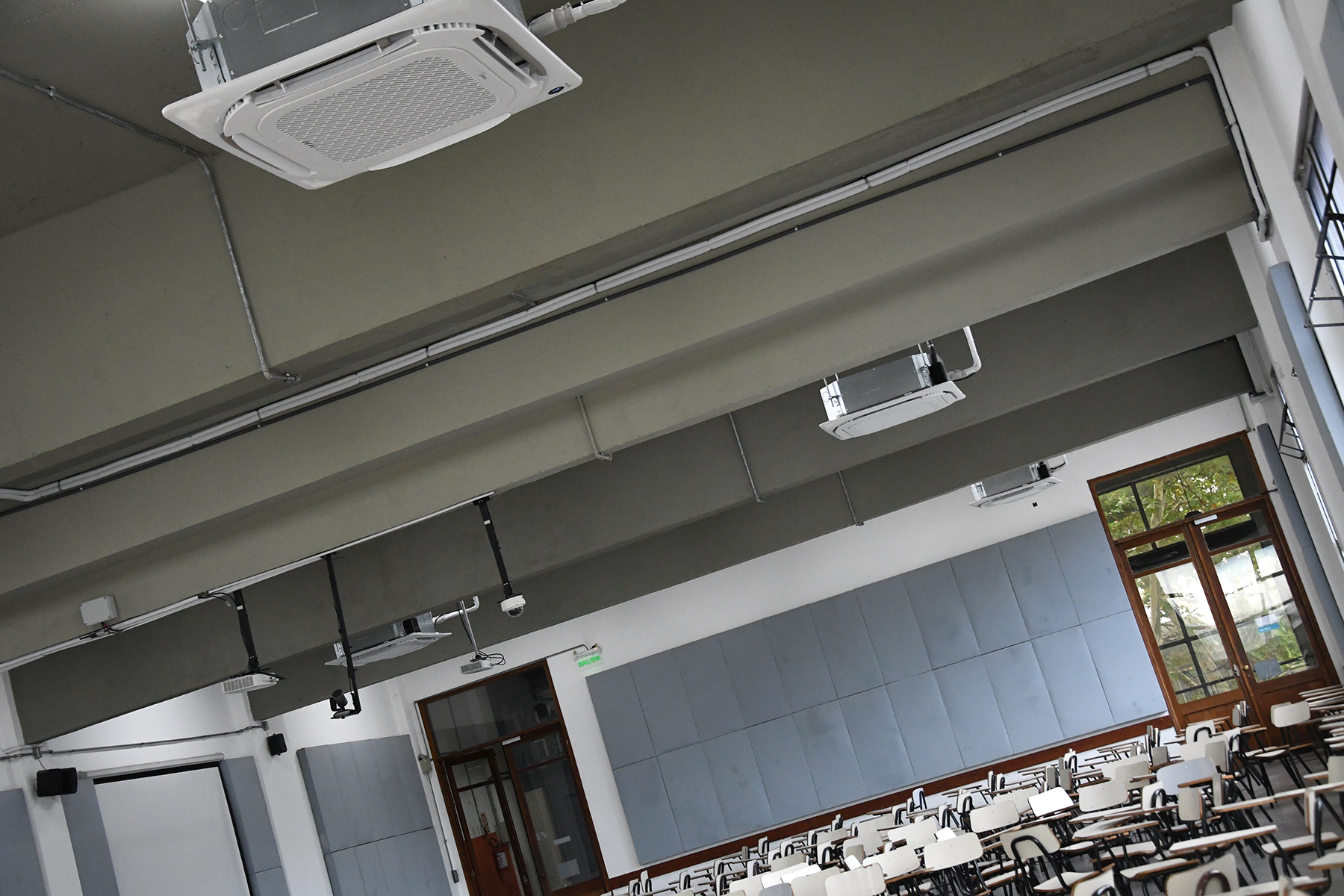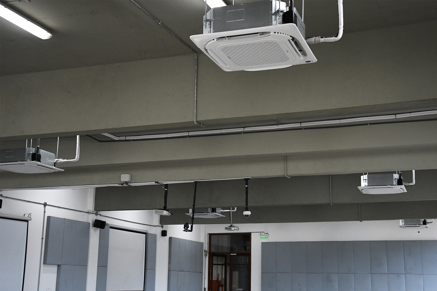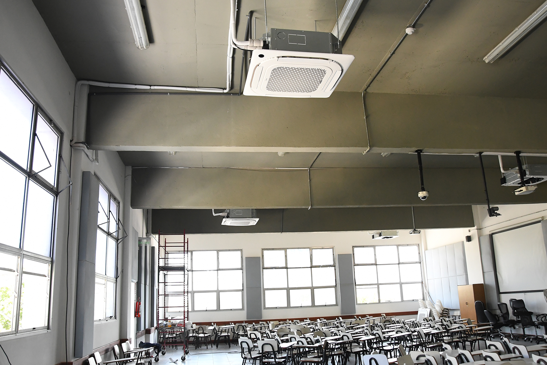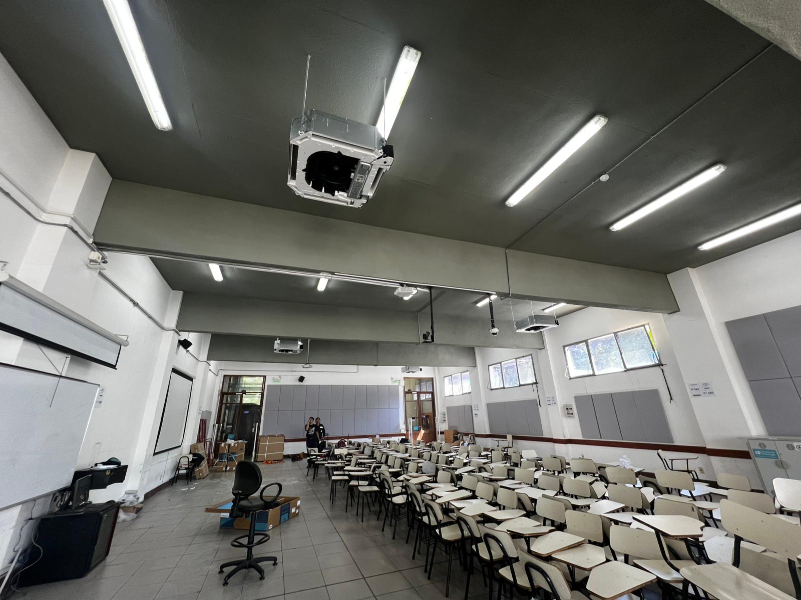El trabajo comprendió la instalación de nuevos equipos de aire acondicionado del tipo mini split casette, con el objetivo de asegurar una regulación efectiva de la temperatura y proporcionar un mayor confort térmico a estudiantes, docentes y participantes de las diversas actividades que allí se desarrollan. Sumado al acondicionamiento acústico realizado previamente en estos salones, esta intervención mejora sustancialmente la habitabilidad de los espacios.