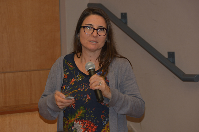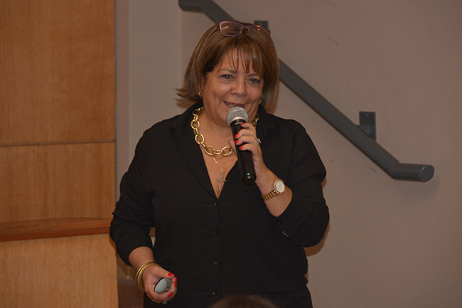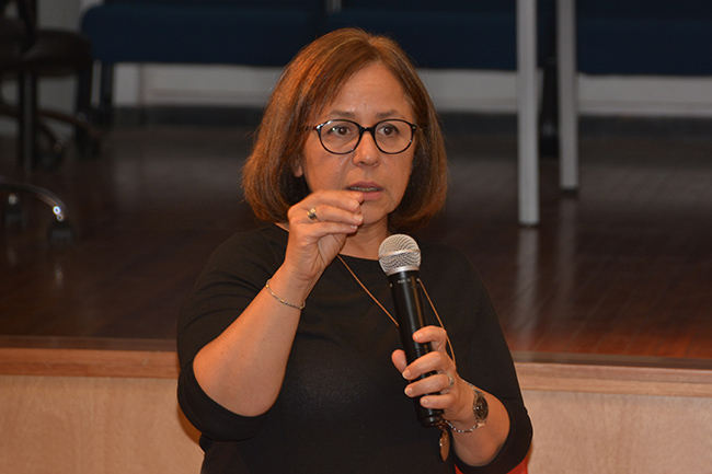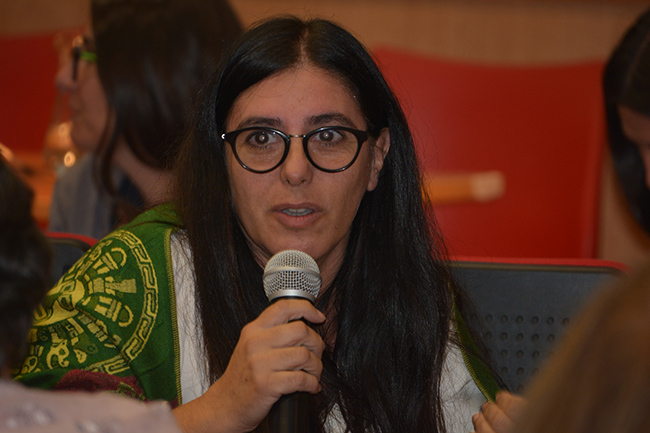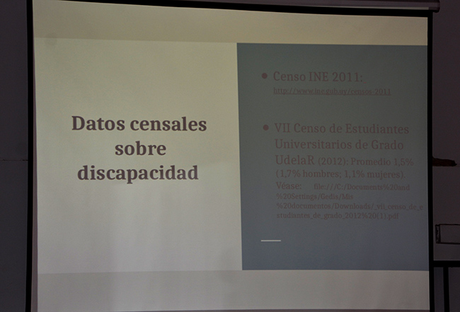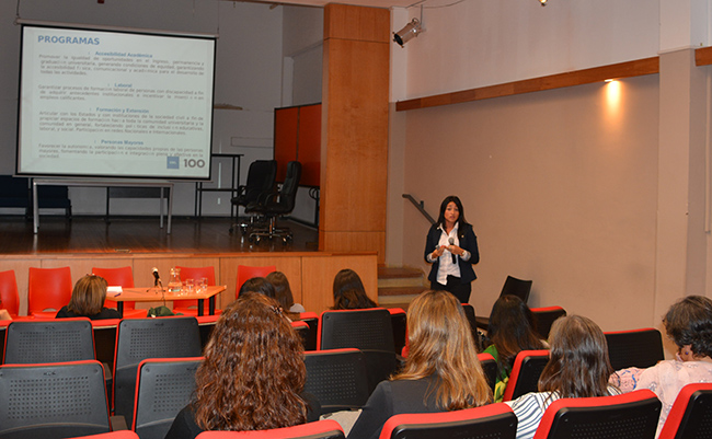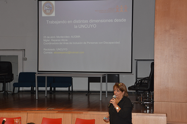A continuación la Magíster Alicia Reparaz, coordinadora del Área de Inclusión de Personas con Discapacidad de la Universidad Nacional de Cuyo (Mendoza), presentó su disertación "Trabajando en distintas dimensiones desde la UNCuyo". Expuso sobre el trabajo de la universidad en la detección y registro de personas con discapacidad (aspirantes, estudiantes y docentes), la orientación de postulantes, las bibliotecas accesibles y el asesoramiento a egresados para su inserción laboral.
