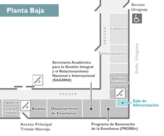 La Sala de Alimentación se encuentra ubicada en la planta baja del edificio central de la Facultad y está habilitada de lunes a viernes de 7 a 23 horas, y sábados de 7 a 12 horas. Para acceder se debe solicitar la llave en la Sección Vigilancia.