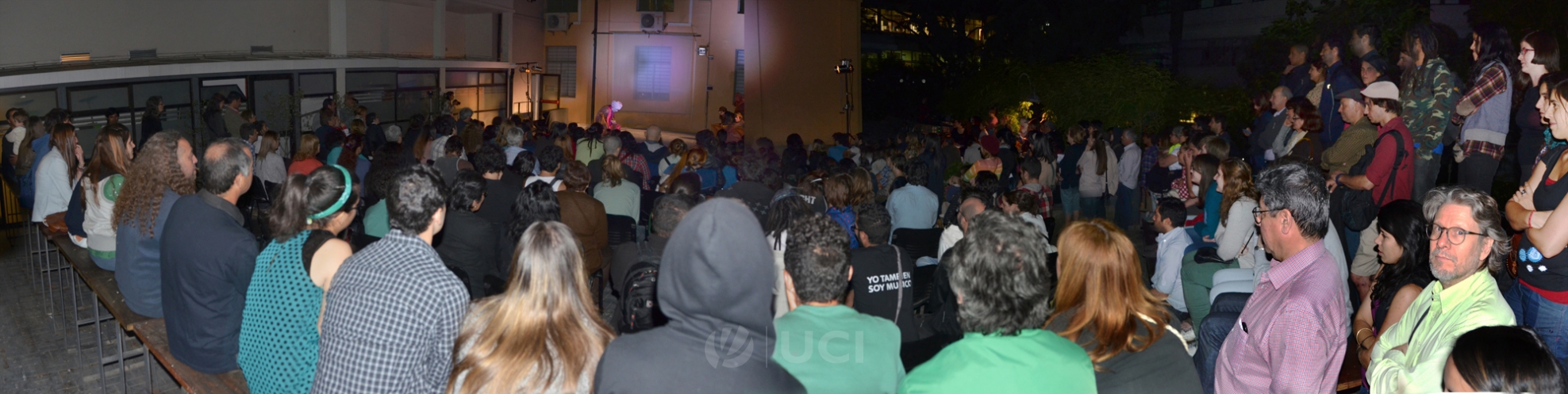 A las 21.30 horas, el patio de Facultad se llenó de vida con los Bufones de la EMAD. Aprovechando la celebración, los estudiantes de la Escuela de Arte Dramático realizaron su examen de la materia Estilos y Géneros Puros II (Bufones), con el Prof. Mario Aguerre.