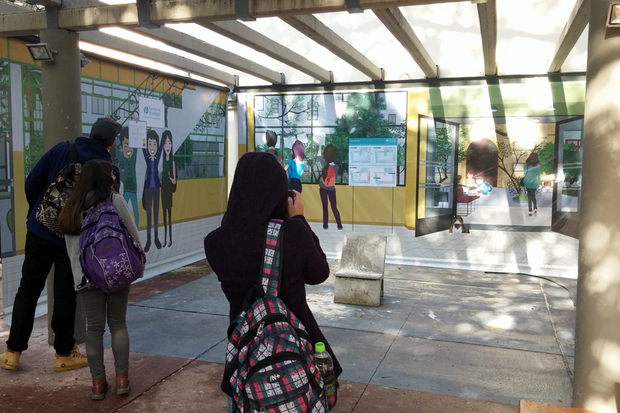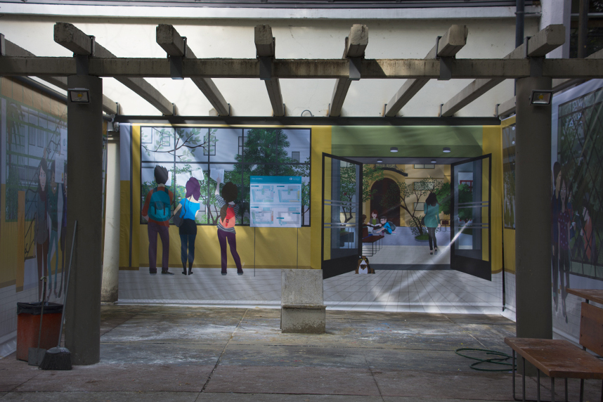 Esta semana se colocaron las lonas que terminan de definir el espacio para los festejos de finalización de la carrera. Se trata de tres cortinas enrollables con manivela, de 5 metros de largo, que ilustran ciertos pasajes de los/as estudiantes por las locaciones, situándolos en diferentes momentos de la carrera.