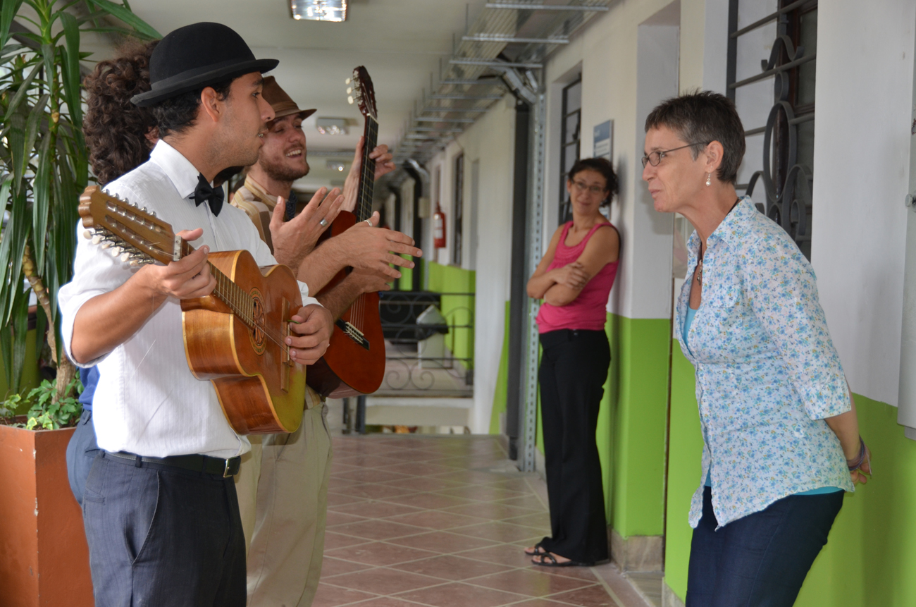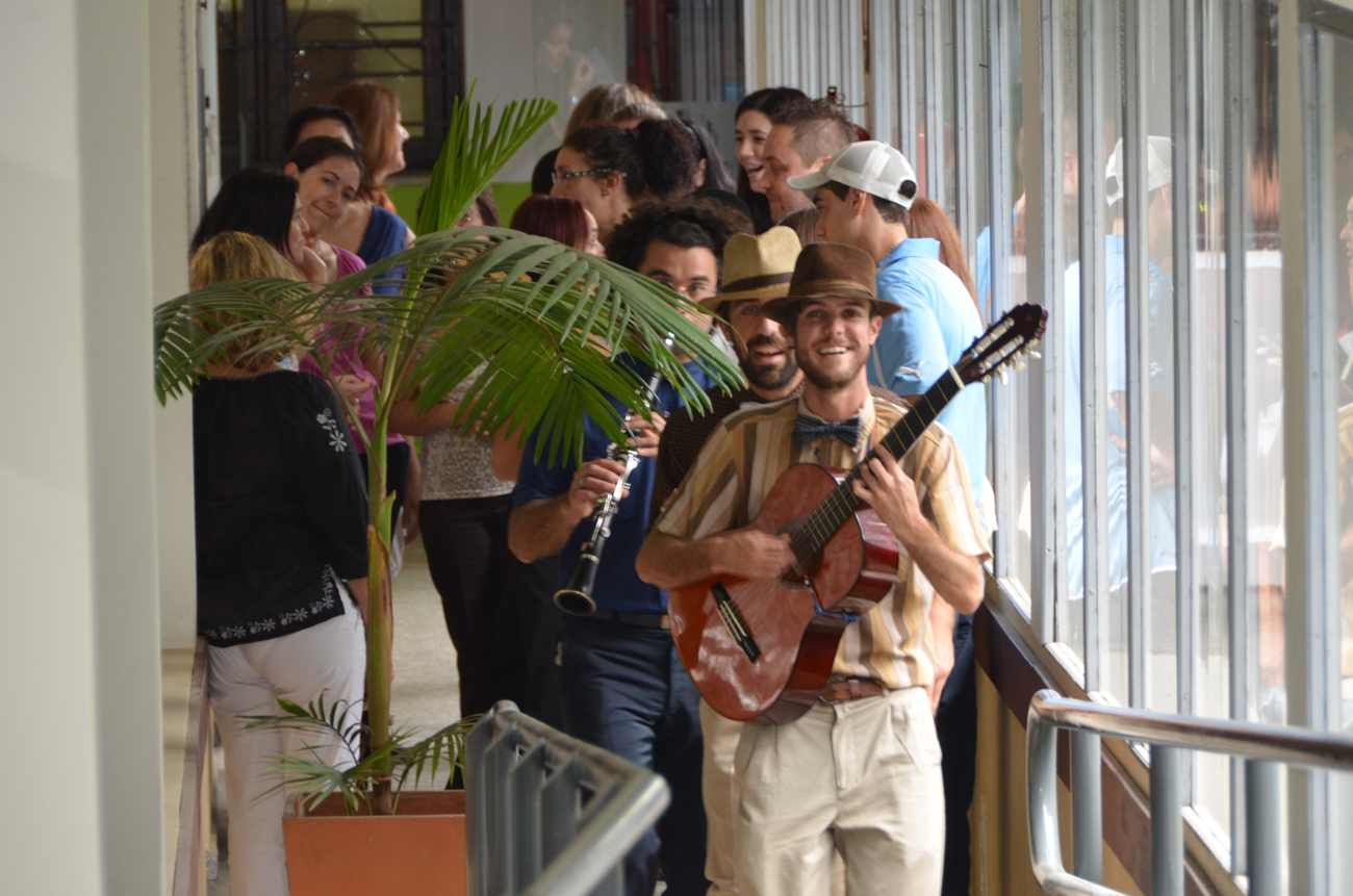 Sobre las 13 hs., "El cuarteto del amor" recorrió la Facultad convocando a todos los presentes. Entre serenatas y risas se dirigieron al Aula Magna, donde hicieron uso de la palabra el Decano Luis Leopold y Cristina Petit -Vice Decana de la Facultad de Psicología de la Universidad Nacional de Córdoba- quien trasmitió un saludo de su Facultad y de la AUAPsi (Asociación de Unidades Académicas de Psicología).