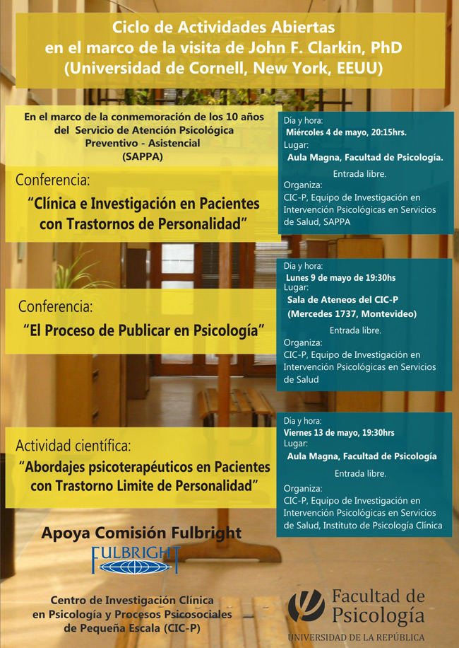 En el marco de la visita del Profesor John Clarkin, PhD (Universidad de Cornell, New York, EE.UU) a la Facultad de Psicología se invita a participar de la siguiente actividad: