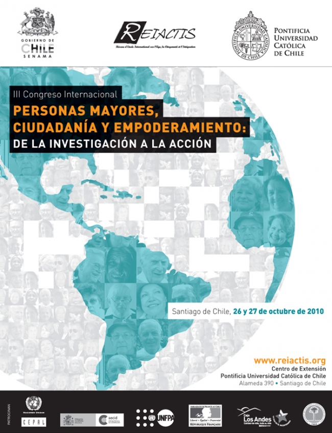 Dada la importancia de abordar con profundidad estas temáticas, es que la Pontificia Universidad Católica de Chile, el Servicio Nacional del Adulto Mayor (SENAMA) y la Red Internacional de Estudios sobre la Edad, la Ciudadanía y la Integración Social REIACTIS (www.reiactis.org) organizan el Congreso Internacional “Personas Mayores, ciudadanía y empoderamiento: de la investigación a la acción”, iniciativa que ha reunido a estas instituciones con el objetivo de profundizar en políticas, desafíos y tareas para los adultos mayores en la región.