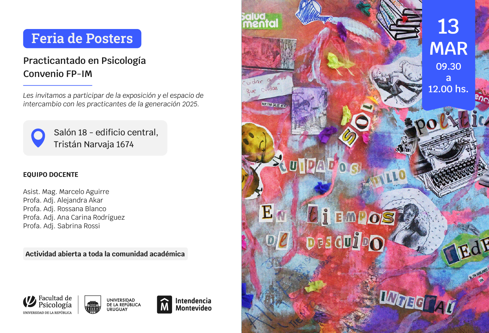 Instancia de intercambio abierta a la comunidad, donde los y las estudiantes de la cohorte 2025 compartirán su experiencia práctica en las distintas dependencias de la Intendencia de Montevideo y los aportes para la formación en psicología.