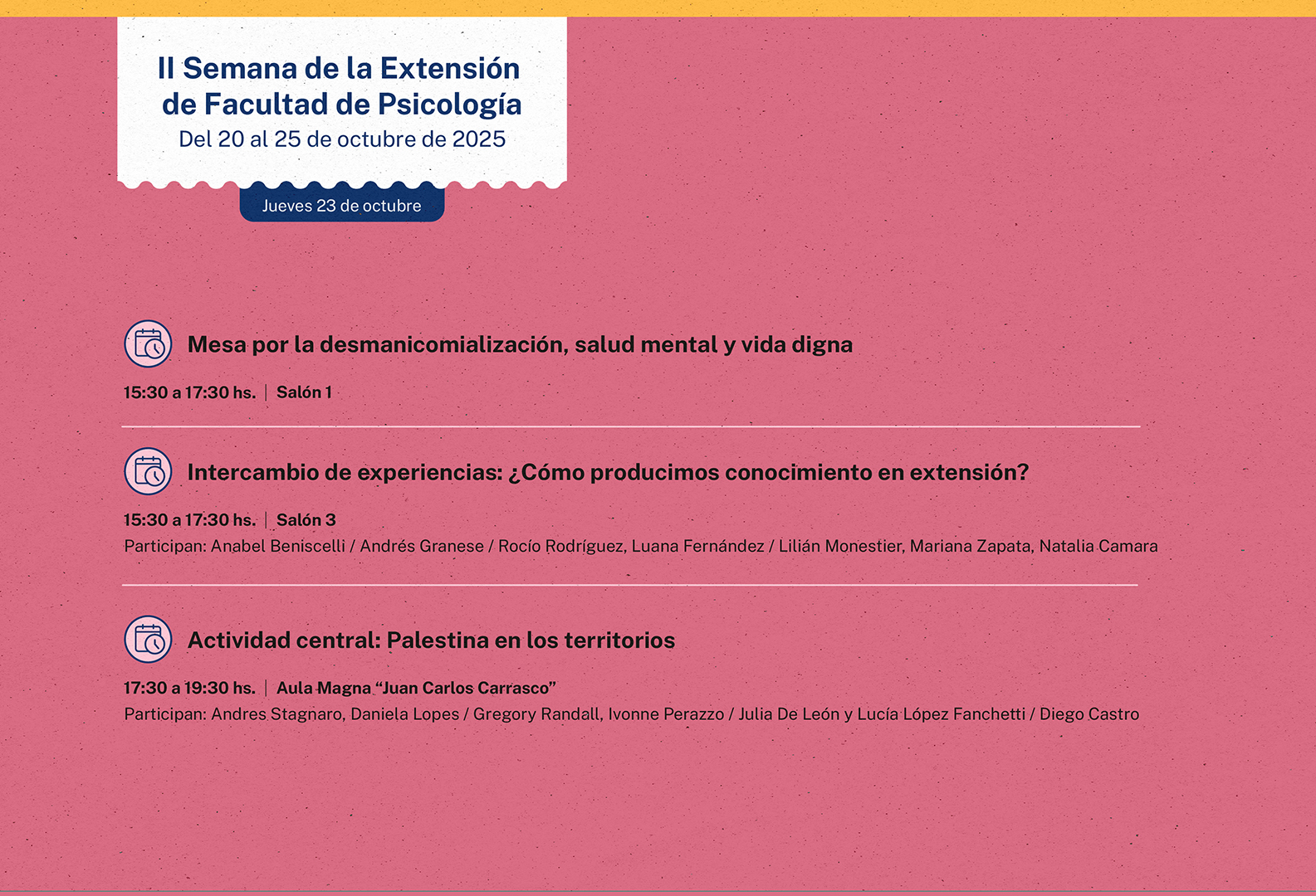 Del 20 al 25 de octubre de 2025, la Facultad de Psicología celebrará la II Semana de la Extensión, una instancia de formación, intercambio y reflexión sobre las prácticas extensionistas y sus desafíos actuales. El evento se enmarca en el Programa de Fortalecimiento de la Extensión 2024–2026 y es impulsado por la Comisión Cogobernada de Extensión, la Comisión Académica de Extensión (CAE) y la Secretaría Académica para la Gestión Integral y el Relacionamiento Nacional e Internacional (SAGIRNI).