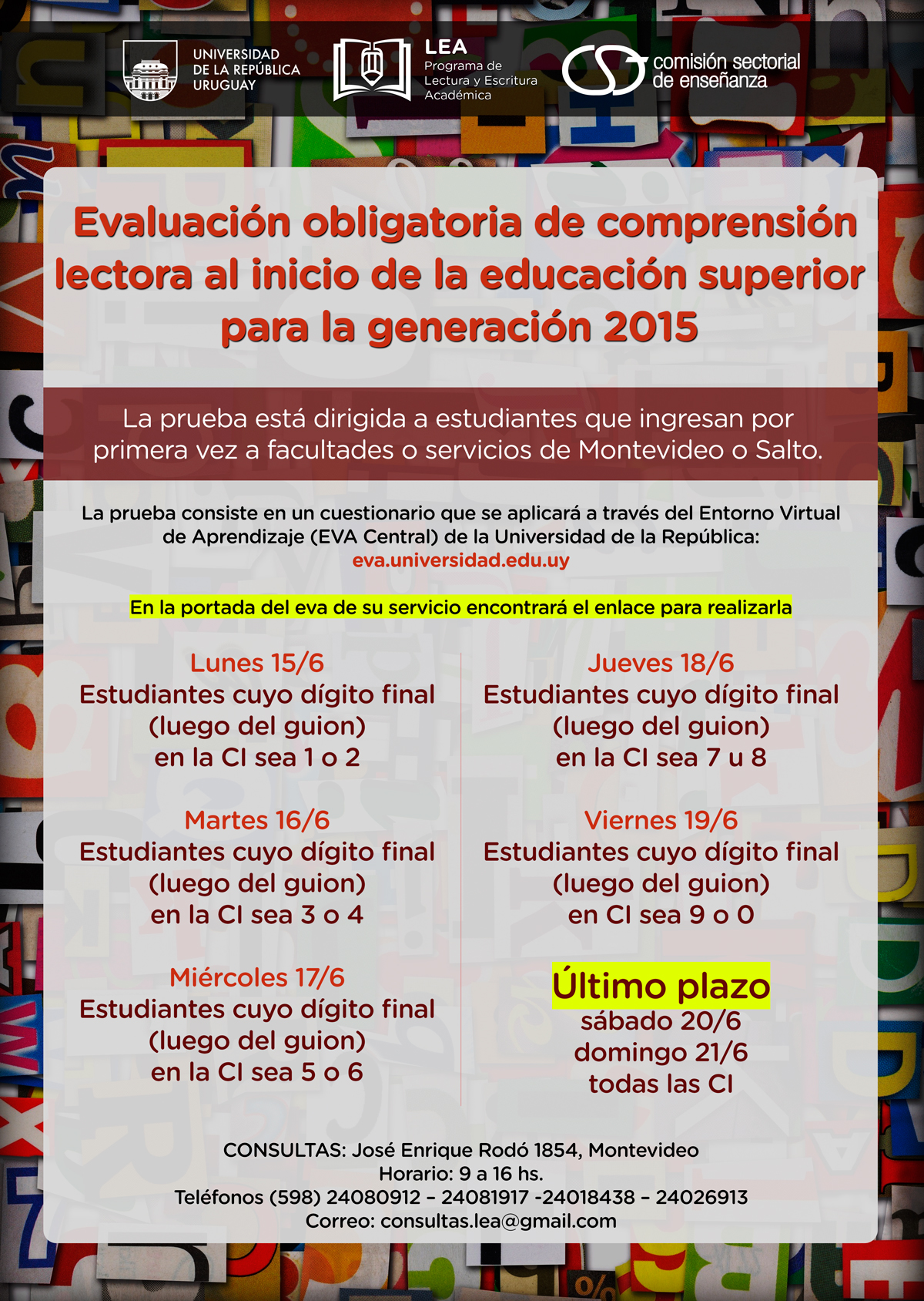 El cronograma de actividades de la prueba LEA fue aprobado por el Consejo Directivo Central en sesión del día 26/05/2015. Agradecemos la más amplia difusión en las páginas web y los EVA de los servicios.