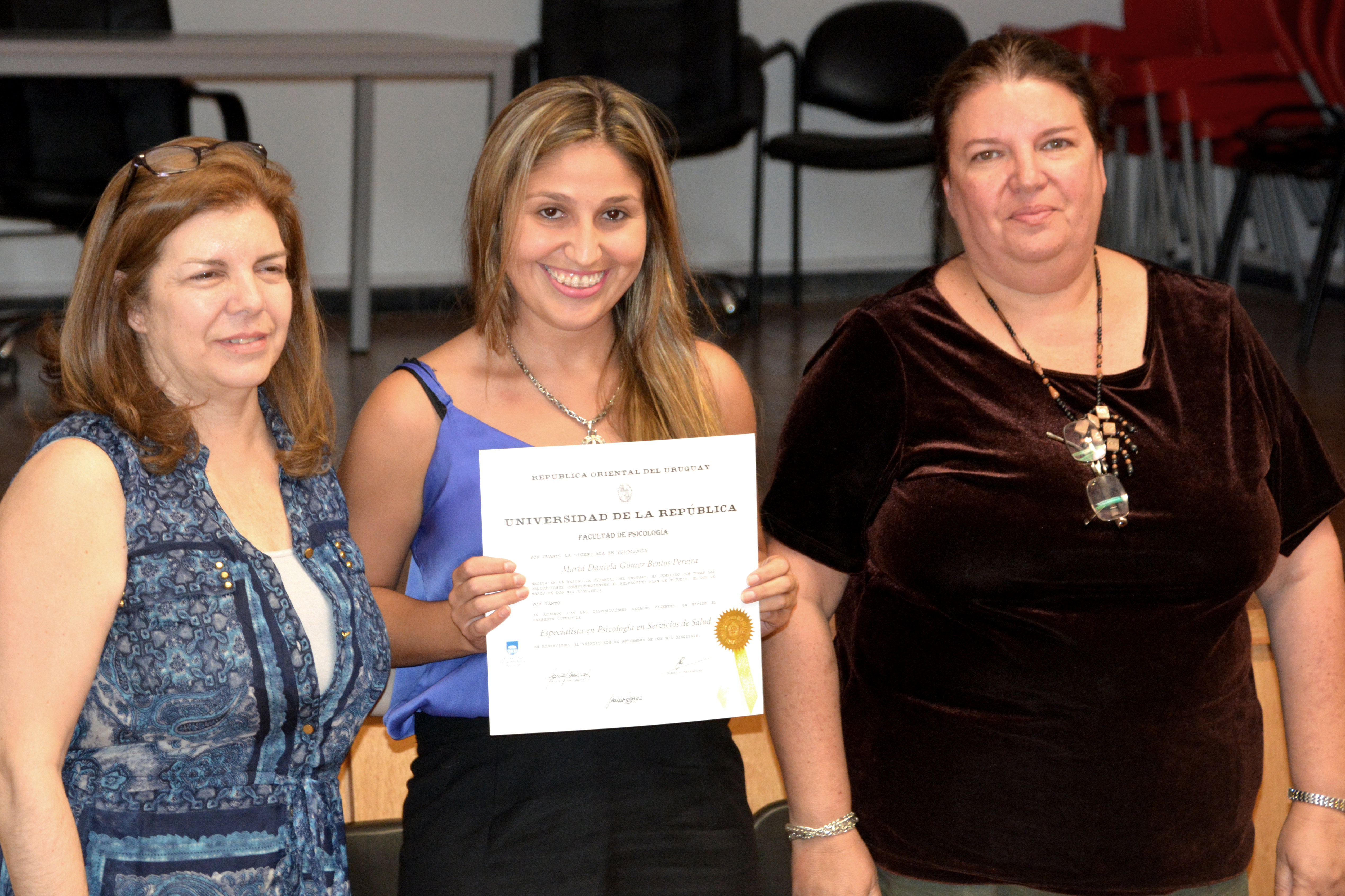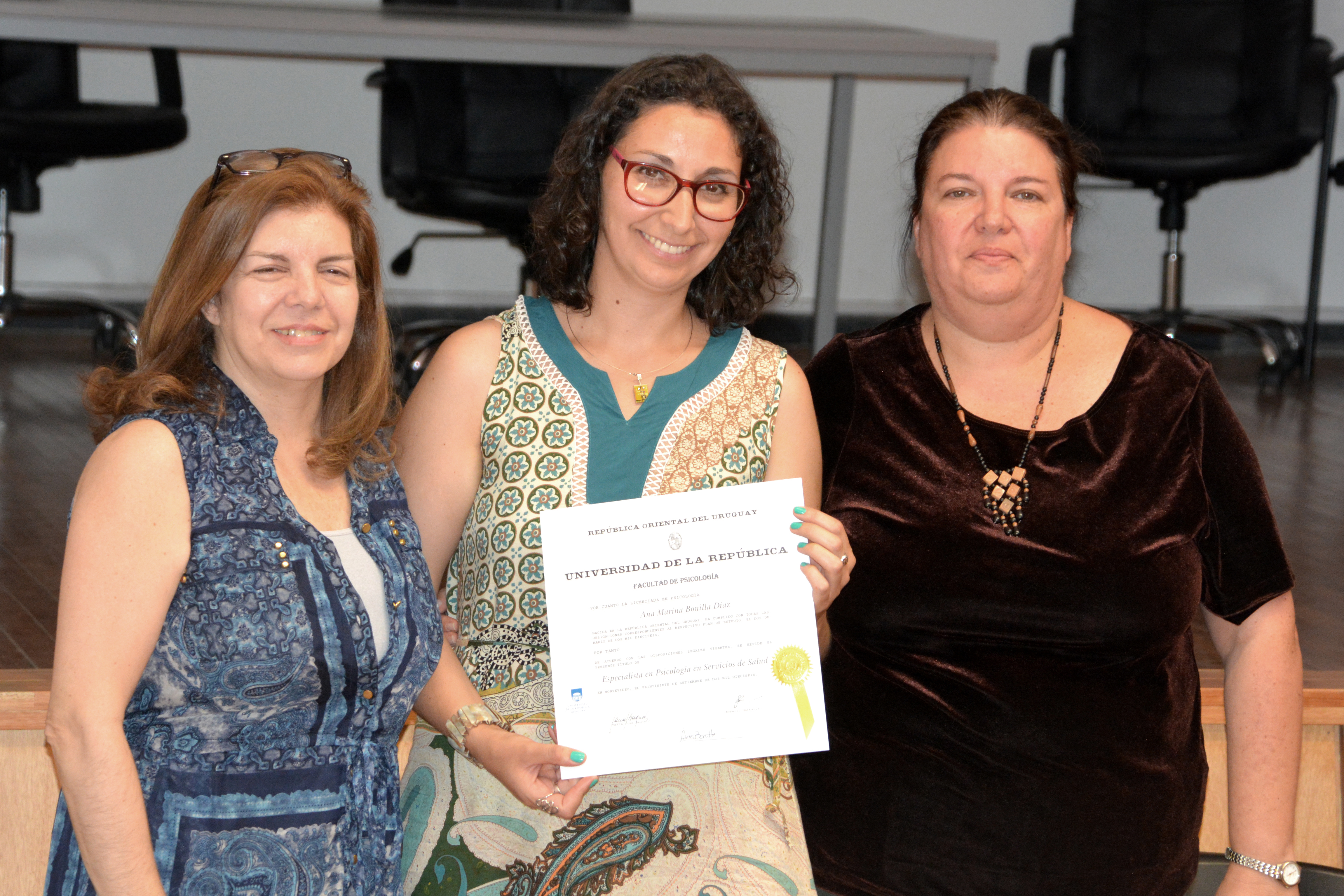 Participaron la Decana, Dra. María José Bagnato; la Prof. Alicia Muniz, una de las Directoras de la Especialización; la Lic. Mag. Natalia Laino, como ex residente e integrante del Comité Interinstitucional para el Convenio; el Lic. Juan Trillo, Coordinador por ASSE para el Convenio; la Lic. Ana Bonilla, en representación de los/as egresados/as, y sus familiares que presenciaron la ceremonia.