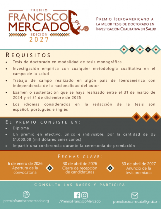 El Premio Francisco Mercado —galardón iberoamericano que reconoce a la mejor tesis de doctorado en investigación cualitativa en salud— tiene abierta su convocatoria para la Edición 2027. Esta distinción busca fomentar la excelencia científica y promover la investigación cualitativa en salud entre jóvenes doctorandos e investigadoras/es de Iberoamérica.