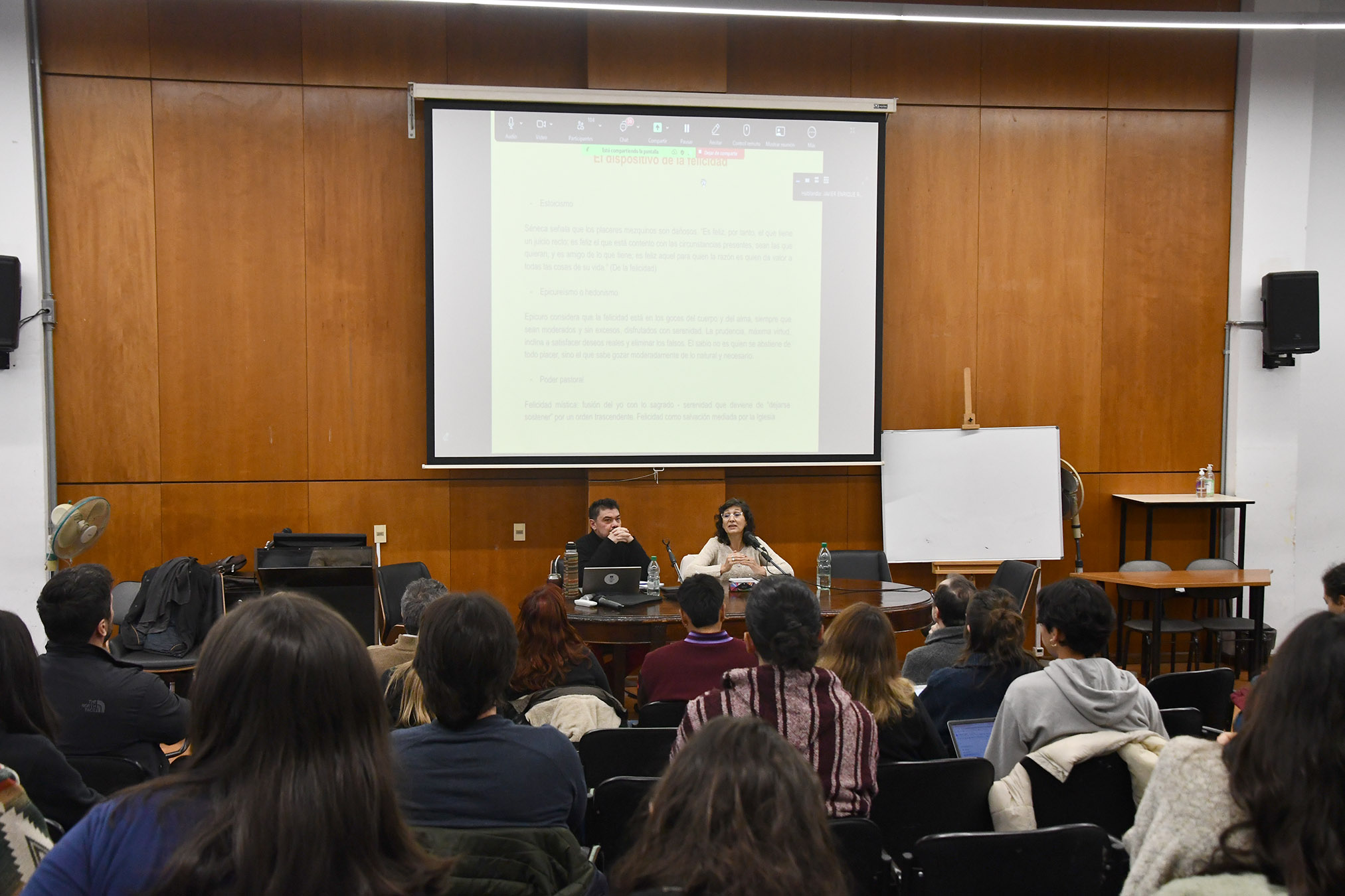 Vanina Papalini inició con una reflexión sobre cómo se han producido históricamente las subjetividades. Retomó categorías de la teoría foucaultiana y deleuziana, y explicó que la subjetividad debía entenderse no como sinónimo de psique, sino como una trama social que nos constituye. Sostuvo que es en los pliegues de esas tramas donde puede emerger cierta autonomía, “donde se desencadenan unos procesos que son un poco distintos a ese afuera que nos constituye”. Recorrió prácticas antiguas de autodisciplina, desde las sectas helénicas hasta la moral cristiana, que tenían como fin transformar el yo, primero hacia la santidad, luego hacia la felicidad.
