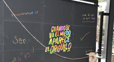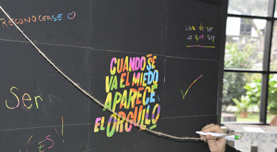 En el marco de este día, desde el 28 de junio y hasta el 5 de julio, permanecerá en el ingreso de la Facultad un tótem para que las personas que así lo deseen puedan intervenirlo dejando su mensaje mediante la técnica de esgrafiado que, bajo una capa negra, deja ver los colores del arcoíris.