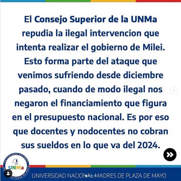 El Consejo Superior de la Universidad Nacional Madres de Plaza de Mayo (UNMa) repudia la ilegal intervención que intenta realizar el Gobierno de Milei. Esto forma parte del ataque que venimos sufriendo desde diciembre pasado, cuando de modo ilegal nos negaron el financiamiento que figura en el presupuesto nacional. Es por eso que docentes y no docentes no cobran sus sueldos en lo que va del 2024.