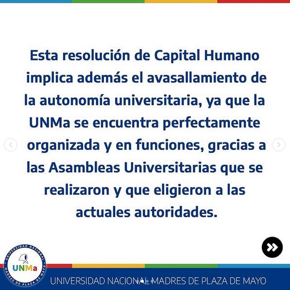Esta resolución de Capital Humano implica además el avasallamiento de la autonomía universitaria, ya que la UNMa se encuentra perfectamente organizada y en funciones, gracias a las Asambleas Universitarias que se realizaron y que eligieron a las actuales autoridades.