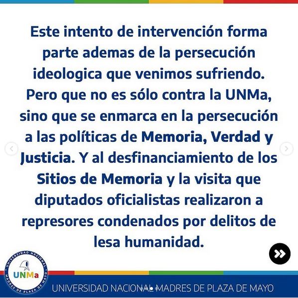 Este intento de intervención forma parte además de la persecución ideológica que venimos sufriendo. Pero que no es sólo contra la UNMa, sino que se enmarca en la persecución a las políticas de Memoria, Verdad y Justicia. Y al desfinanciamiento de los Sitios de memoria y la visita que diputados oficialistas realizaron a represores condenados por delitos de lesa humanidad.