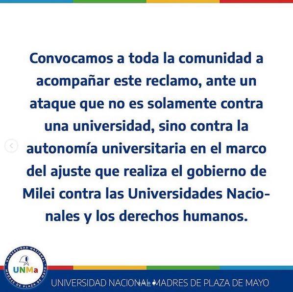 Convocamos a toda la comunidad a acompañar este reclamo ante un ataque que no es solamente contra una universidad sino contra la autonomía universitaria en el marco del ajuste que realiza el gobierno de Milei contra las Universidades Nacionales y los derechos humanos.