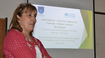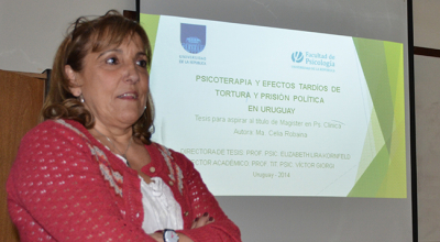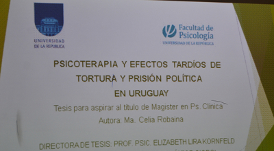 : Psicoterapia y efectos tardíos de tortura y prisión política en Uruguay, ante un tribunal integrado por Prof. Dra. Ana María Araújo (Presidente del Tribunal), Prof. Adj. Mag. Eduardo Viera y Dr. Marcelo Viñar.