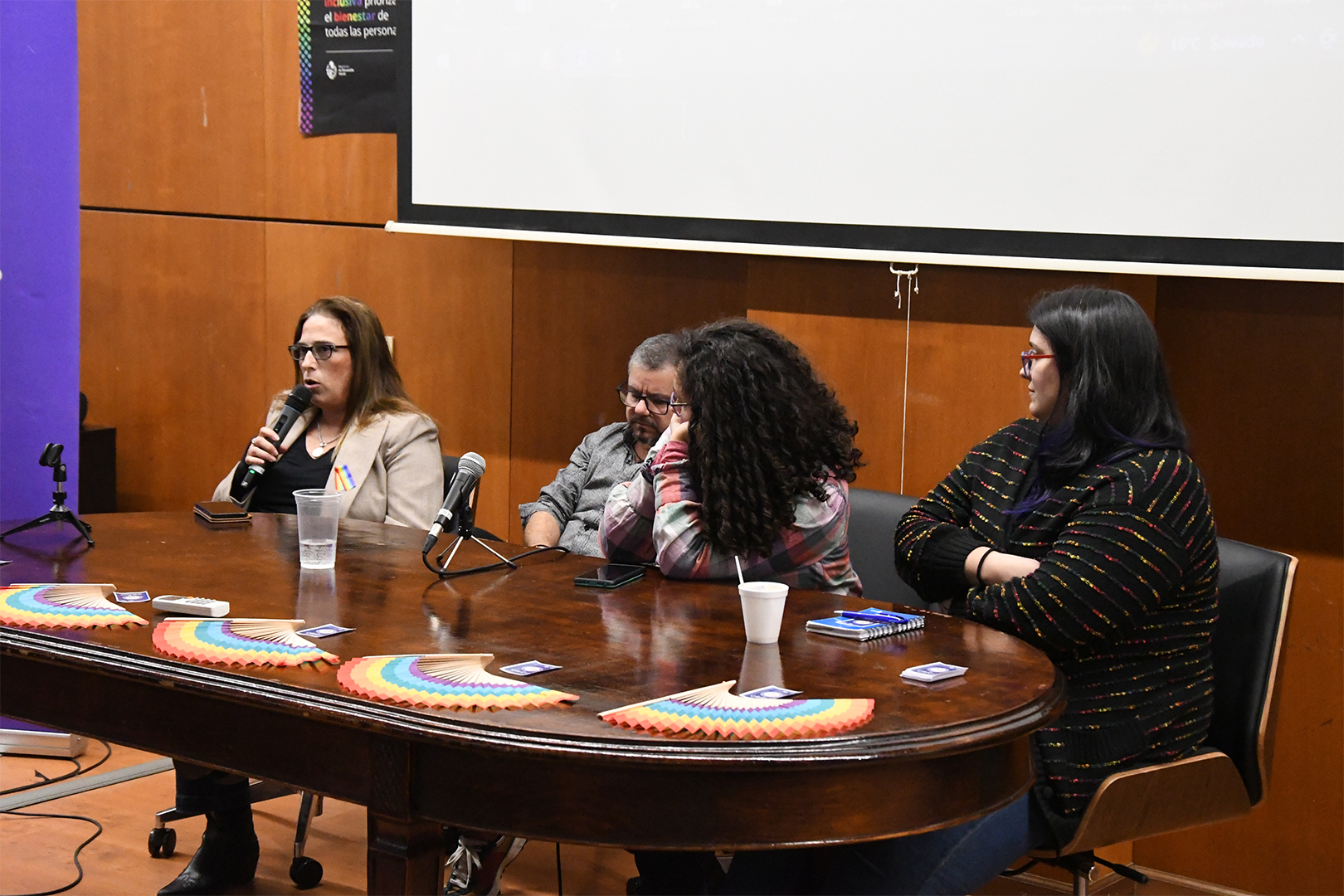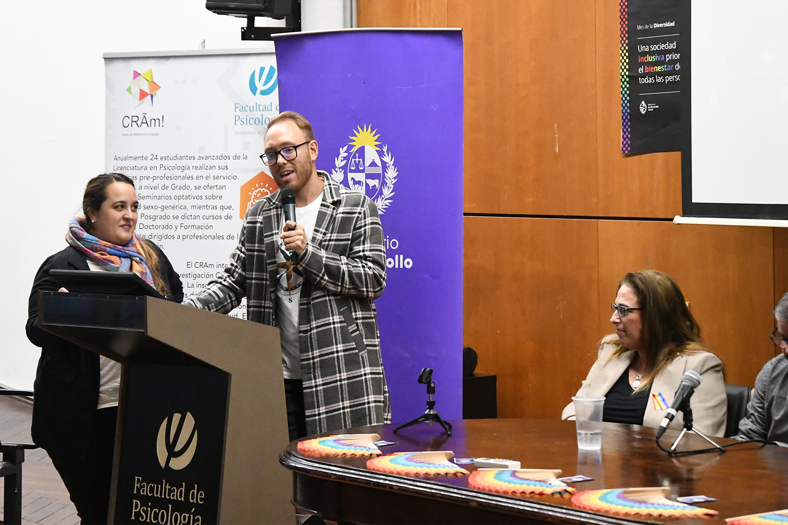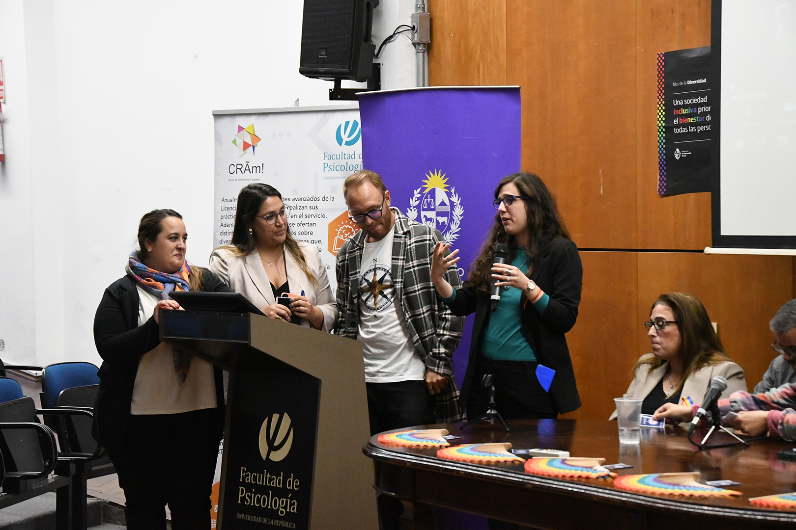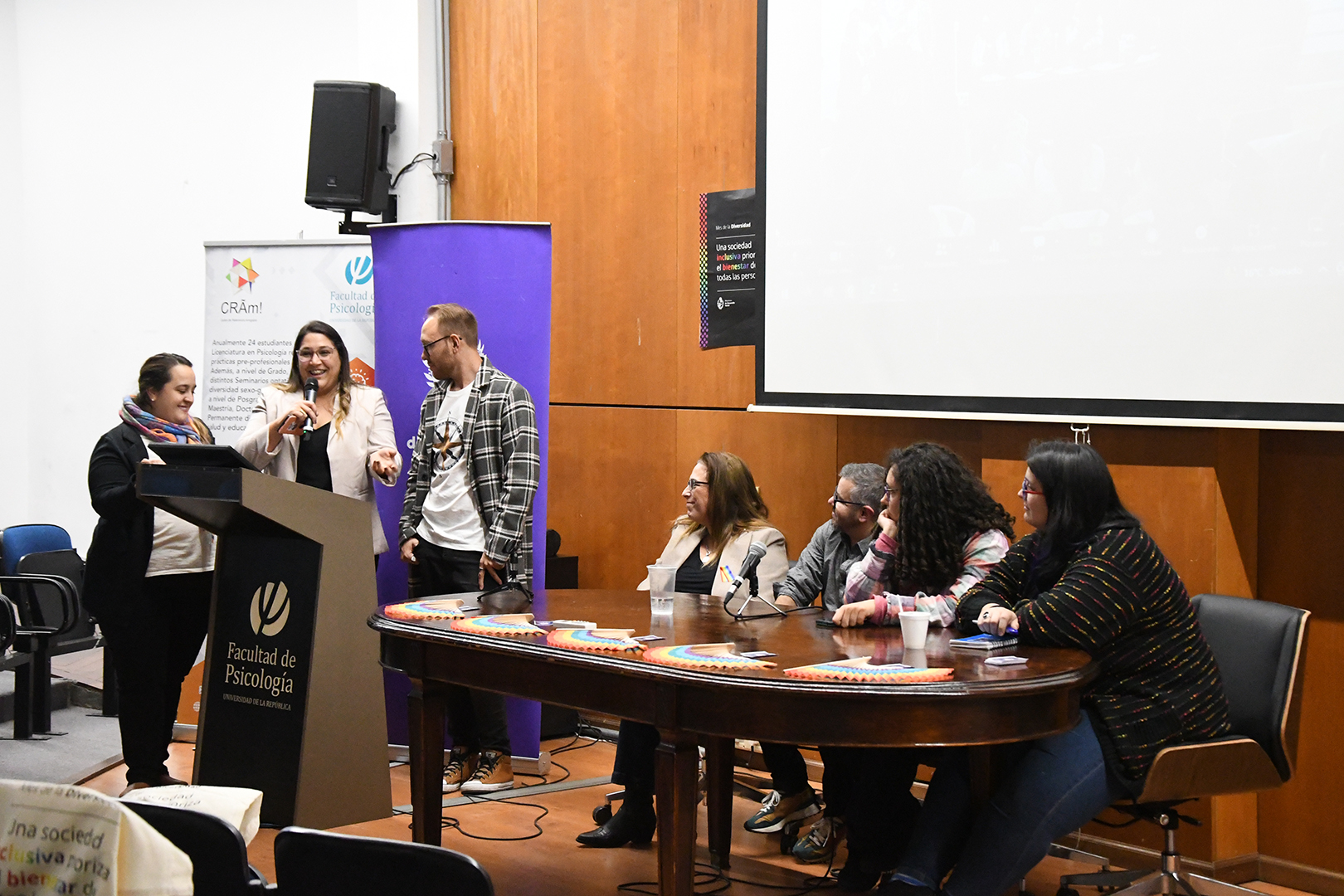 Luego tuvieron lugar las mesas de diálogo interinstitucionales, con Marcelo Álvarez y Ana Santacruz como representantes del Programa de Renovación de la Enseñanza (Proren) de la Facultad de Psicología; Daniel Márquez, como referente de ASSE y Casmu; Gabriela Cirino, docente referente de la Licenciatura de Trabajo Social de la Facultad de Ciencias Sociales en acuerdo de trabajo con CRAM; Adriana Boggio, integrante de la Comisión Asesora Honoraria de Cambio de Nombre e Identidad de Género del Registro Civil; Sergio Miranda, director de la Secretaría de Diversidad de la Intendencia de Montevideo y Andrea Carlos de la Administración Nacional de la Educación Pública (ANEP).
