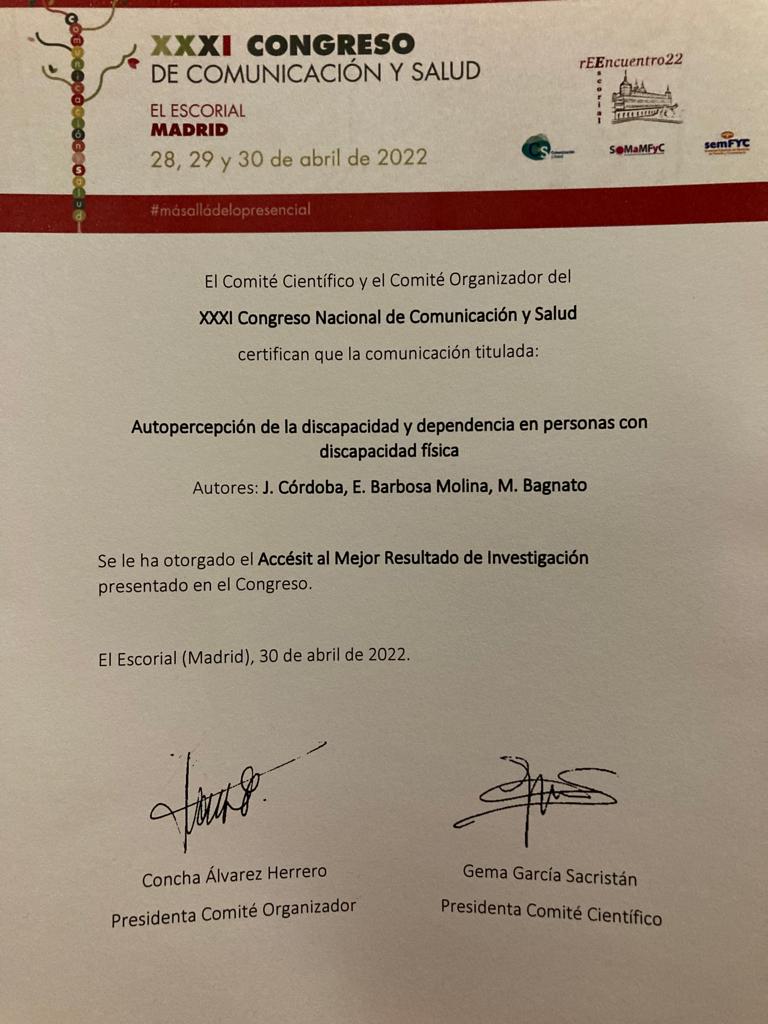 Las premiadas fueron las profesoras Julia Córdoba, Eugenia Barbosa y María José Bagnato por su trabajo “Autopercepción de la discapacidad y dependencia en personas con discapacidad física”.  El reconocimiento otorgado el 30 de abril correspondió al mejor resultado de investigación.