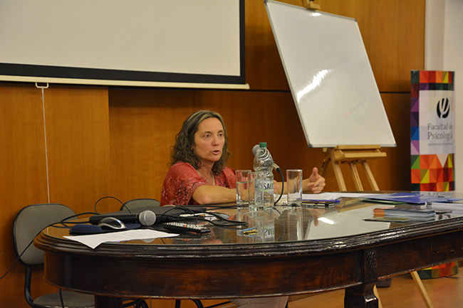 A continuación, Russo abordó al surgimiento de la psicología en el Uruguay, en el que destacó su vínculo con la enseñanza como la principal fuente, y distinguió como pionero a Carlos Vaz Ferreira. Realizó un repaso del desarrollo de la disciplina en el país, en el que enfatizó en los aportes de Juan Carlos Carrasco y Élida Tuana. En esta línea, la docente también relató el progreso de la carrera de psicología en la Universidad de la República, en la que destacó que recién en 1999 se aprobó la ley de reglamentación del ejercicio profesional del psicólogo.